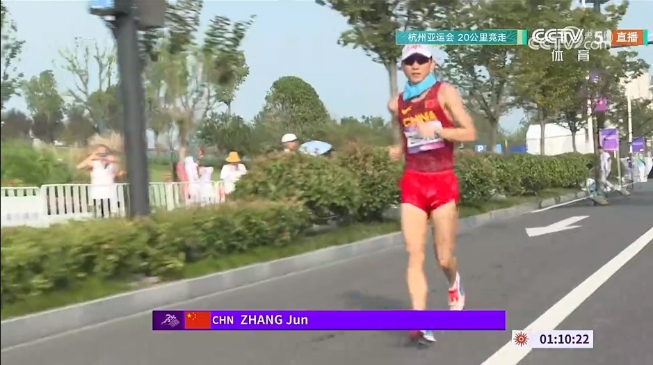 9月29日,杭州第19届亚运会男子20公里竞走决赛,中国选手张俊夺得金牌。