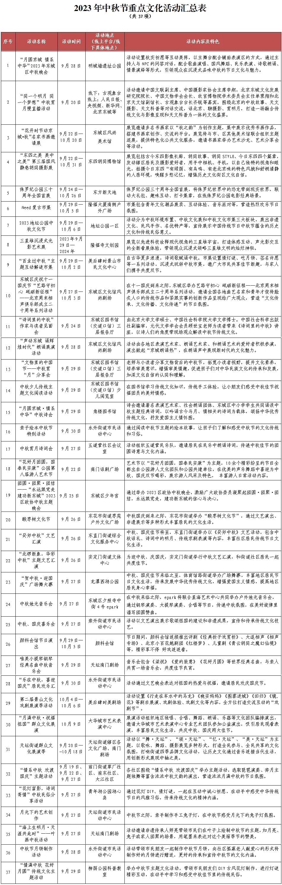 东城区图书馆举办“诗词里的中秋”作家与读者见面会、文物里的中国节——中秋赏“月”分享会、“月圆京城·情系中华”中秋诗会。东城区文化馆开展“声动东城 诵辉煌时代”朗诵展演活动,诵明月之诗,歌窈窕之章,共同营造花好月圆人团圆的节日氛围。