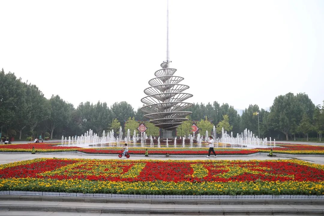 广场中央,怒放的鼠尾草、大花海棠、国庆菊等拼成了不同颜色的色块,从高处俯瞰,犹如一朵五彩斑斓的大型花卉紧紧簇拥着中心的雕塑。