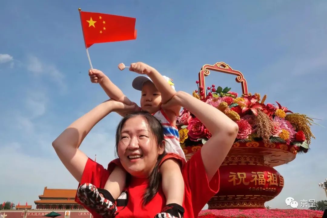 天安门广场国庆花坛前,一位母亲将孩子扛在肩头,孩子挥舞着手中的国旗,一起祝福祖国。 杨建国 摄