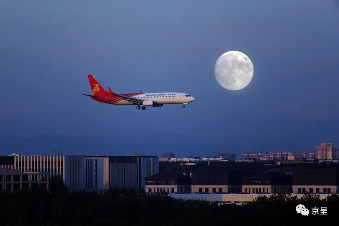 北京首都机场附近,一架飞机从明月前掠过,即将平稳落地。中秋到了,月圆人团圆。 姚建元 摄