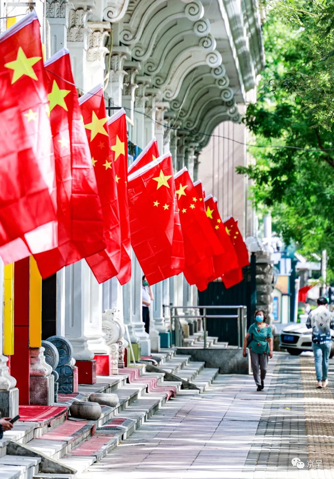 东城区东花市大街上,一排鲜艳的五星红旗迎风招展,千家万户,喜迎佳节。 苏国治 摄