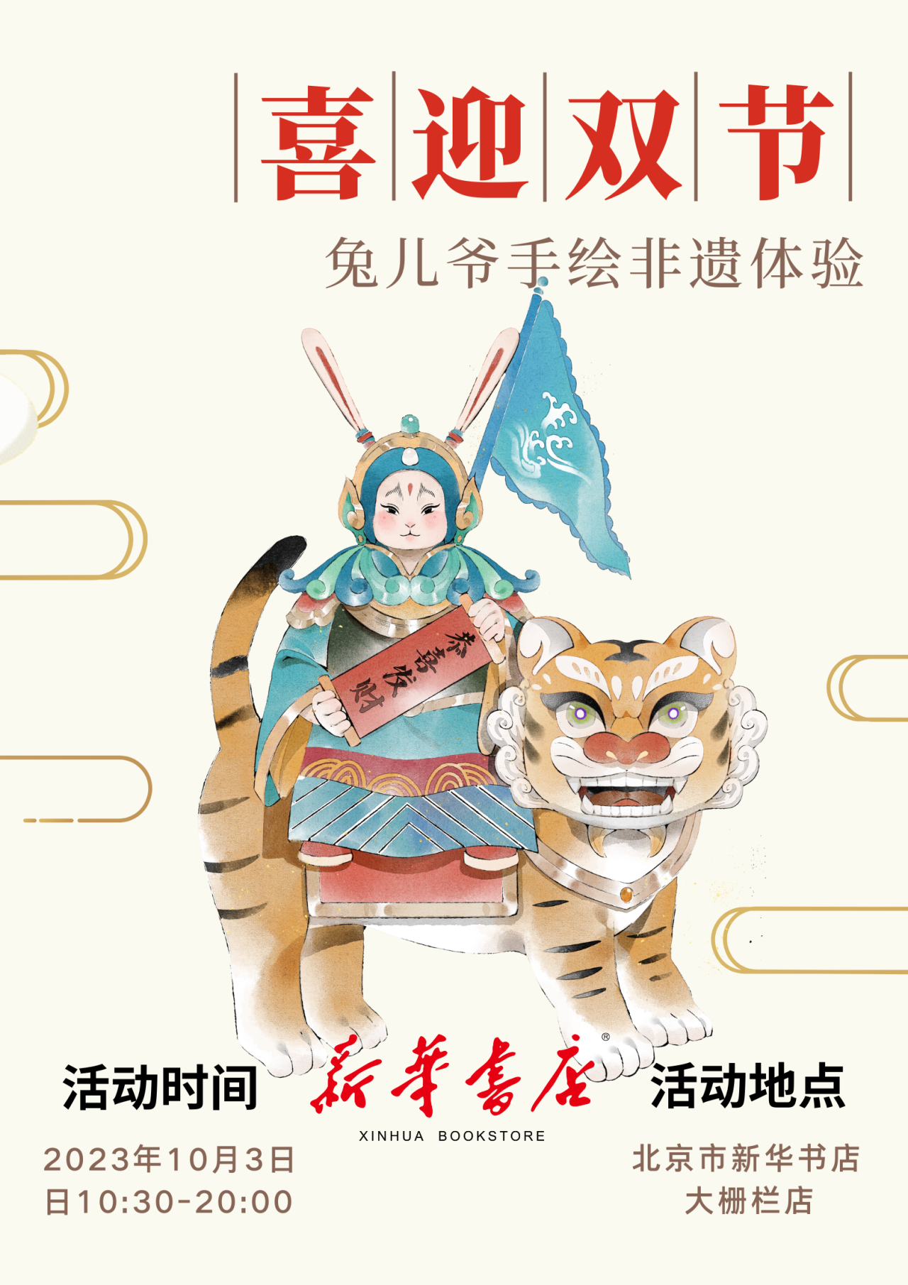 10月3日10:30,在北京市新华书店大栅栏店,北京怿馨阁非遗工作室创始人张宁将到现场带领广大读者体验手绘兔儿爷的制作技艺,并带领大家在帆布袋DIY绘制兔儿爷,感受传统文化魅力。10月5日10:00,在北京市新华书店永安路店,正微书院教师胡国敏到场与小读者分享优秀的传统文化诵读片落,感受浓郁的文化底蕴。