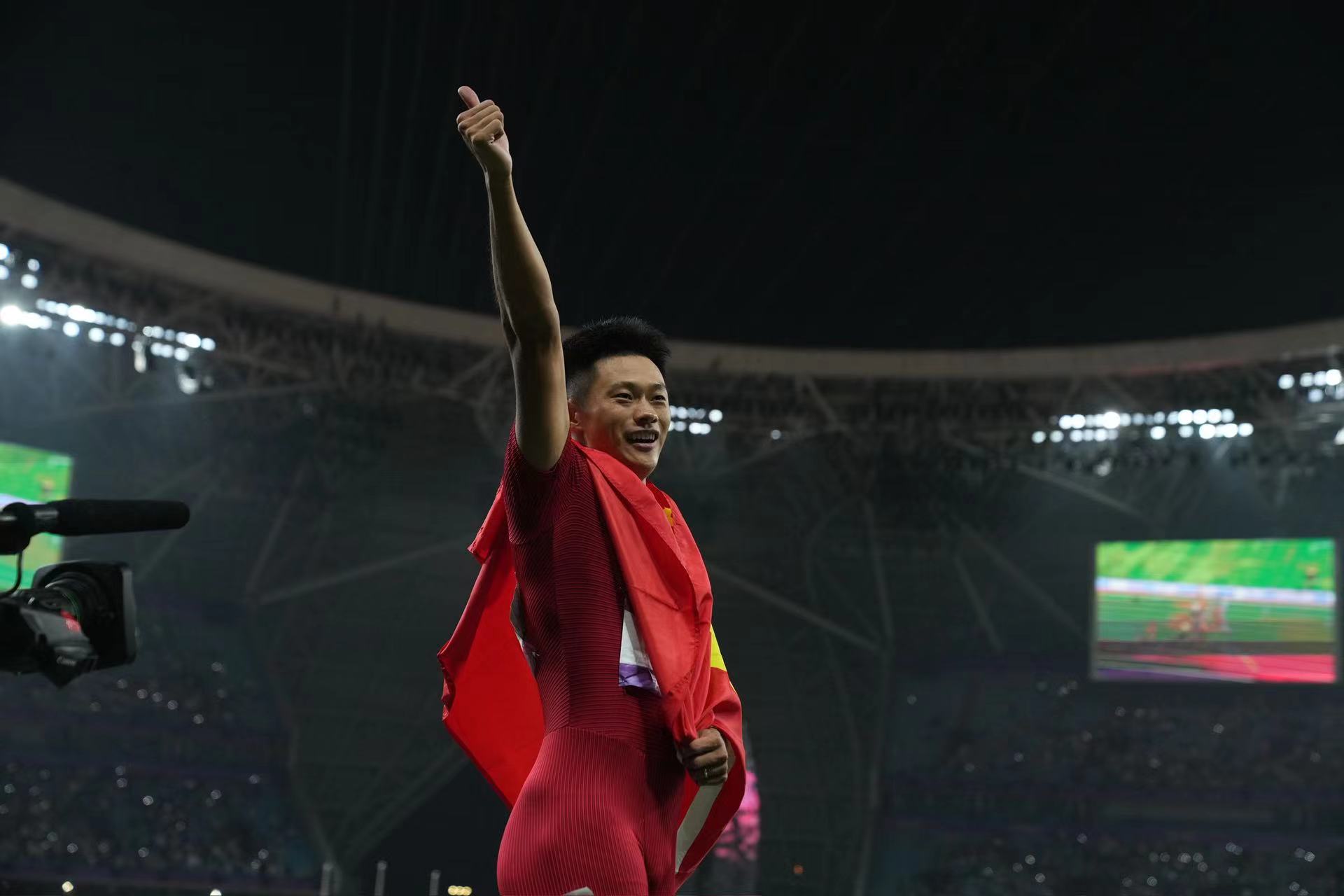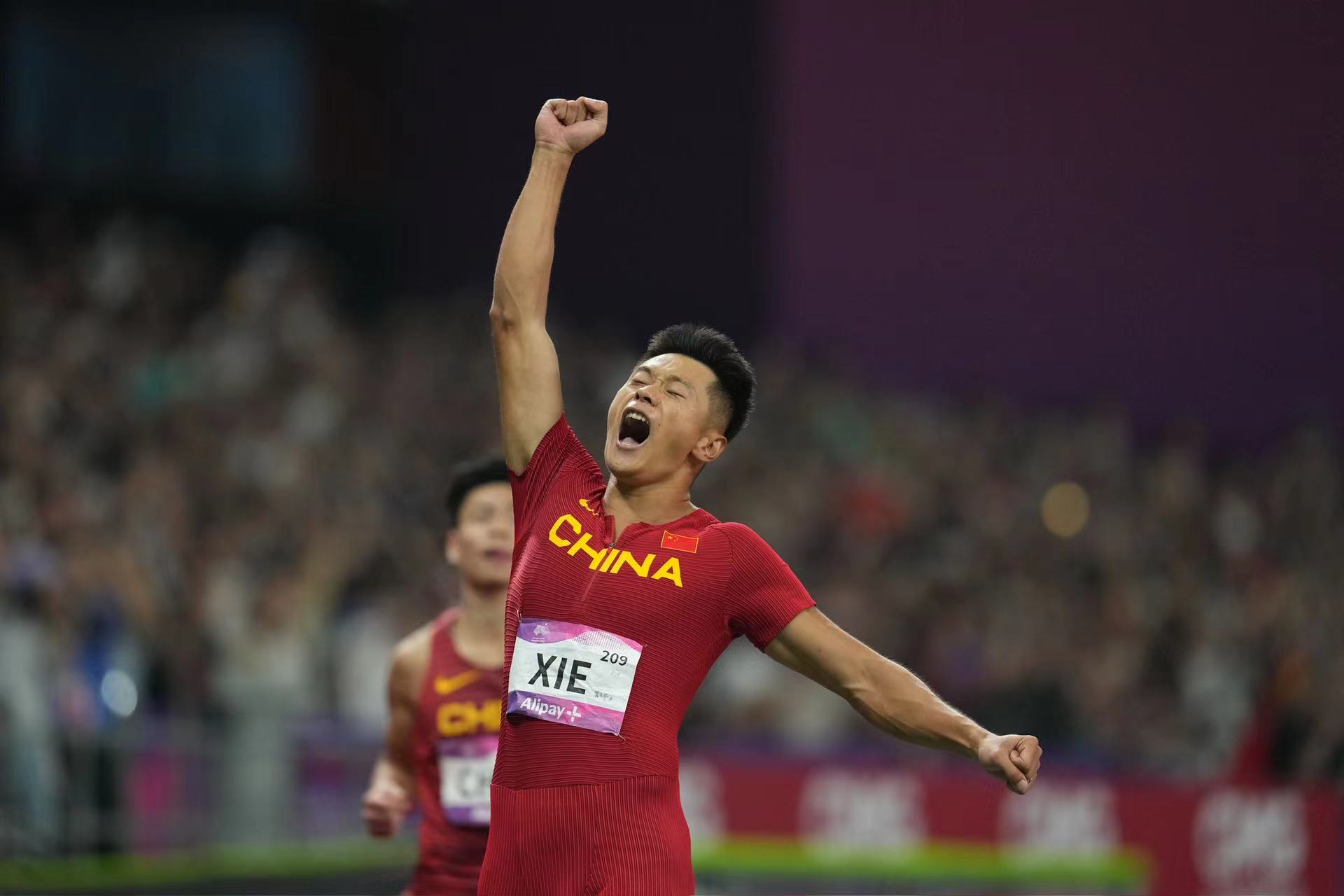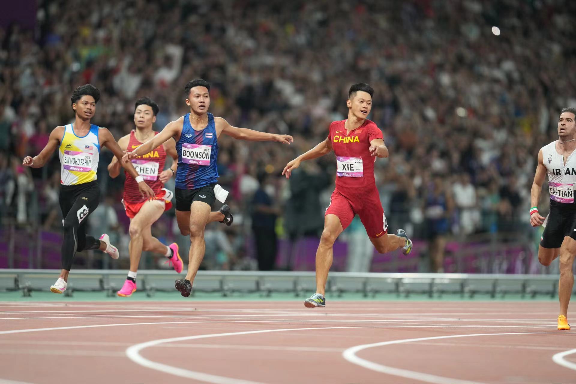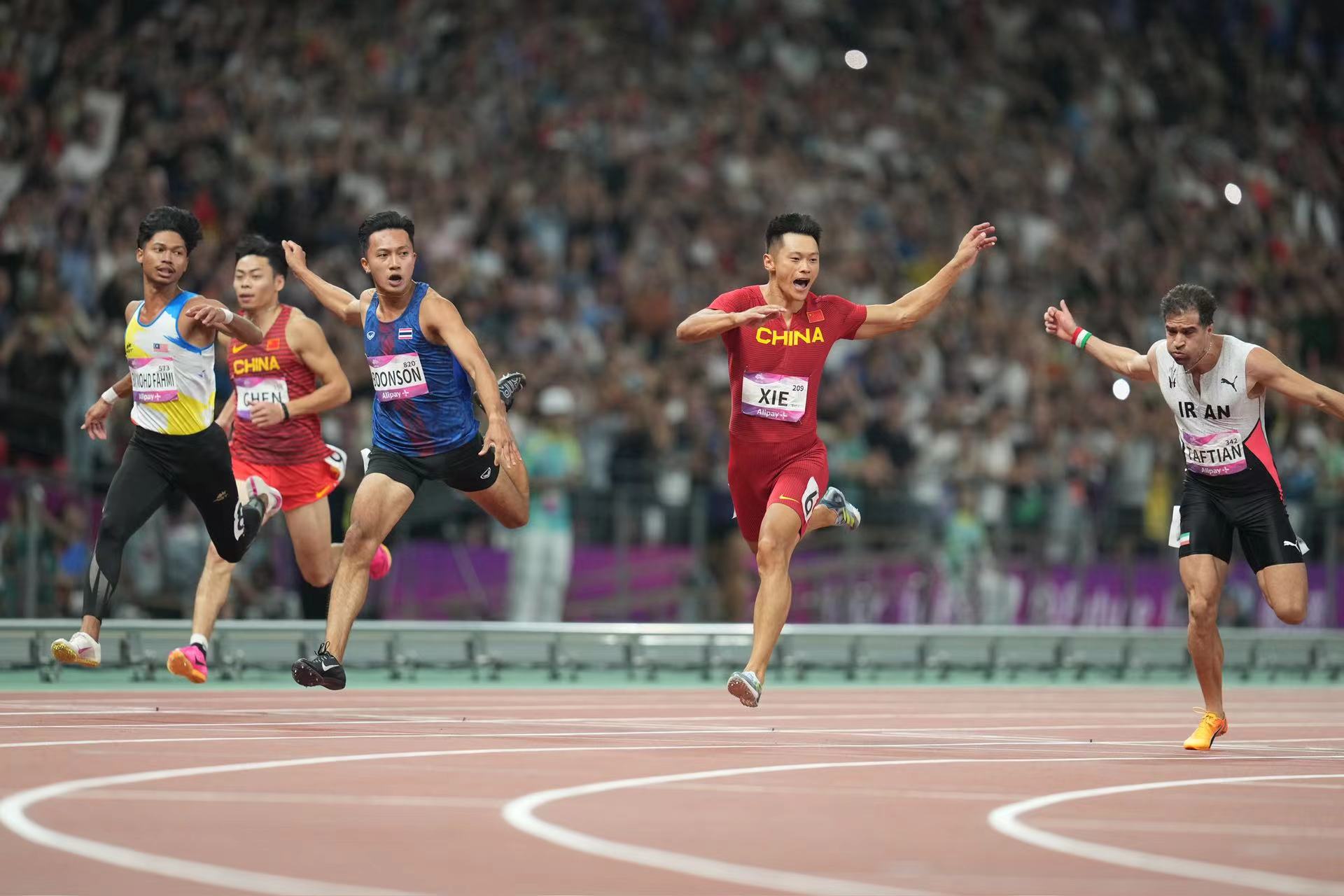 亚运会男子100米决赛,中国选手谢震业以9秒97的成绩夺得冠军。决赛第一枪有选手抢跑,比赛重新开始。发令枪第二次响起,谢震业全力冲刺,第一个冲过终点,成绩为9秒97,这是谢震业第三次在百米项目上闯进10秒大关。在苏炳添休赛的情况下,谢震业担负起了中国男子短跑在亚运会上冲金的重任,他不负众望、继苏炳添在上届亚运会百米夺冠后,为中国田径蝉联夺得这枚分量最重的田径金牌。