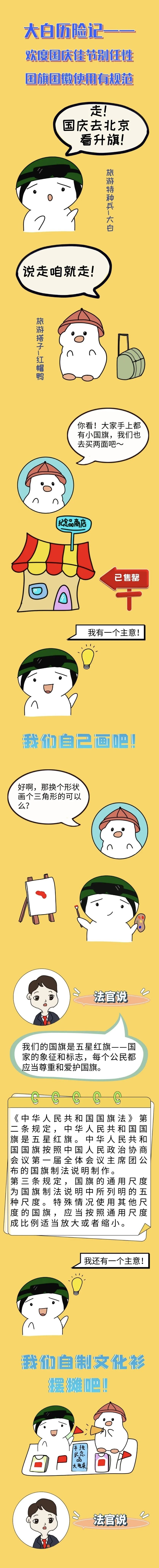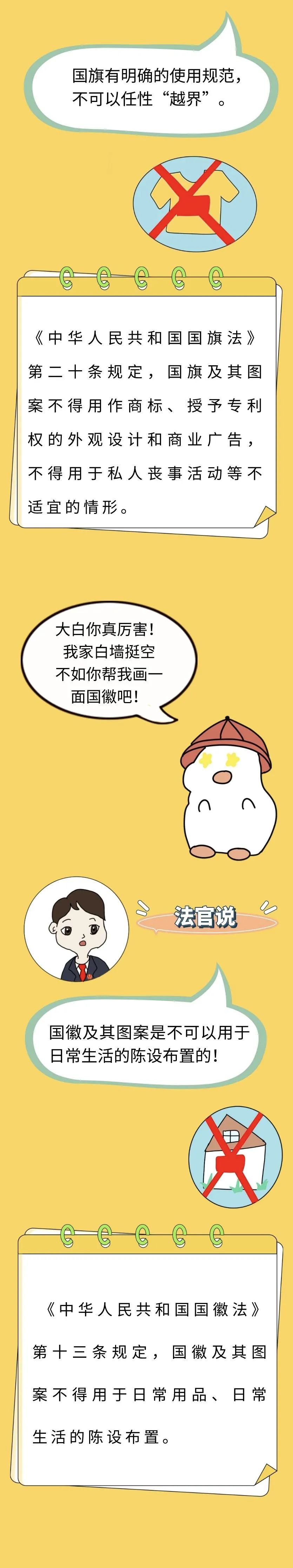 国旗、国徽代表着国家的尊严,是民族精神、爱国主义精神的集中体现。大白的经历告诉我们,国旗、国徽应当正确、规范使用。欢度国庆佳节,也不要忘记与法律知识同行哦~