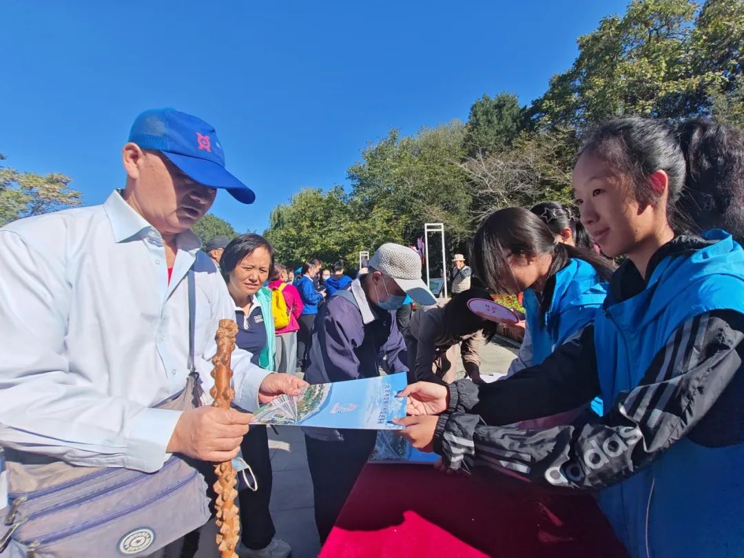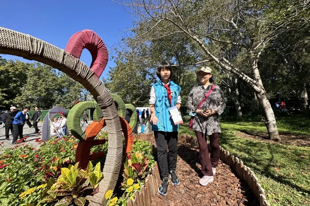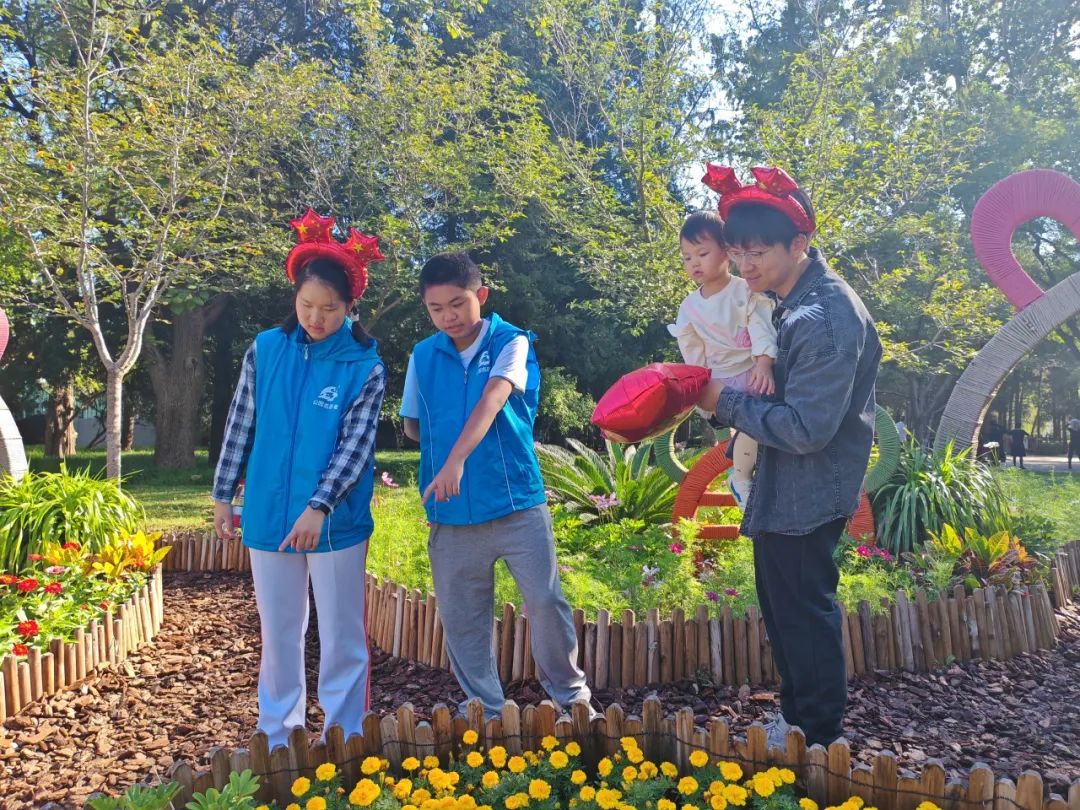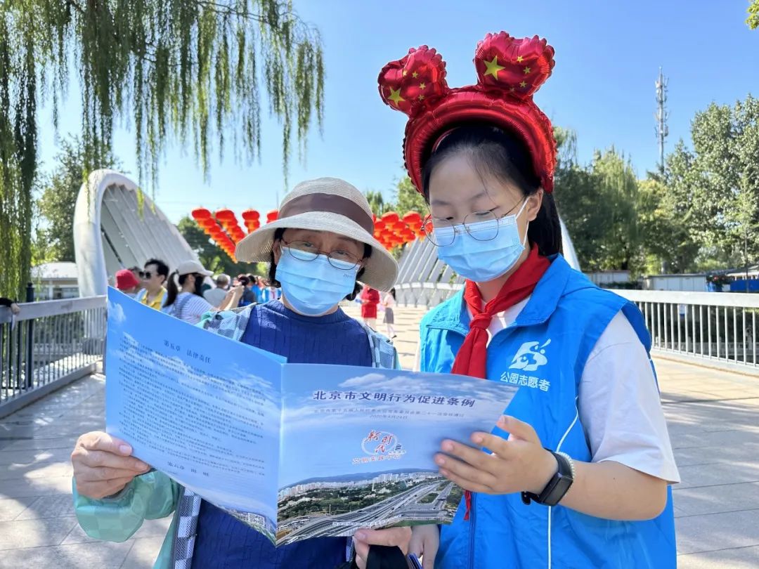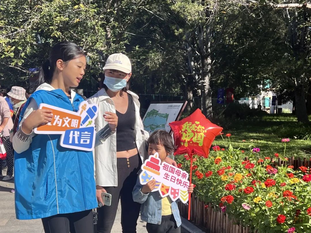 公园志愿者手持“我为文明代言”、“文明游园共建共享”等文明引导牌示在南门“兔子爱萝卜”步入式主题花境前为大家讲解花境的创新亮点,还为来园游客发放文明游园主题宣传折页,共同传递“与祖国同庆,与文明同行”的理念!