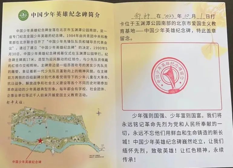 节日期间,欢迎广大市民游客来园参观打卡中国少年英雄纪念碑,体验红色之旅。打卡后还可以来到公园游客服务中心,领取“中国少年英雄纪念碑盖章手册”,获取专属“纪念印章”。