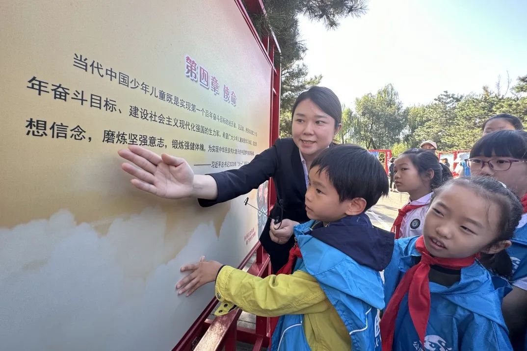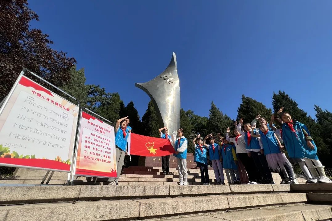 随后,讲解员带领现场的少先队员们共同重温入队誓词,在少先队队旗下,当右拳高高举起,少先队员们齐声呼号:“准备着,为共产主义事业贡献力量!。”伴随着字字铿锵、句句响亮的入队誓词,不仅调动了少先队员的爱国热情,还进一步增强了队员们的荣誉感和自豪感。最后,全体队员们齐声高唱《中国少年先锋队队歌》,并向中国少年英雄纪念碑致少年先锋队队礼。