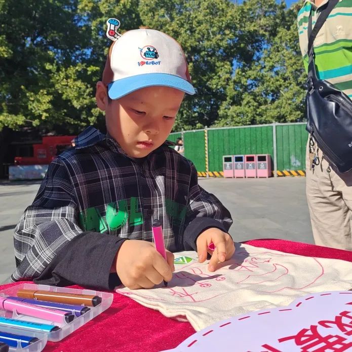 在手工制作区,小朋友们和家长一起用彩笔进行国庆环保袋涂色,大家根据自己喜欢的颜色,充分发挥想象力,认真地勾画,共同祝愿祖国繁荣昌盛!