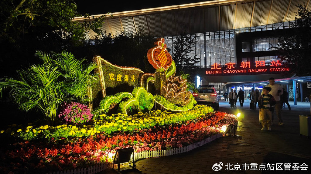 北京朝阳站前,欢度国庆主题花坛在灯光下尽显烂漫。