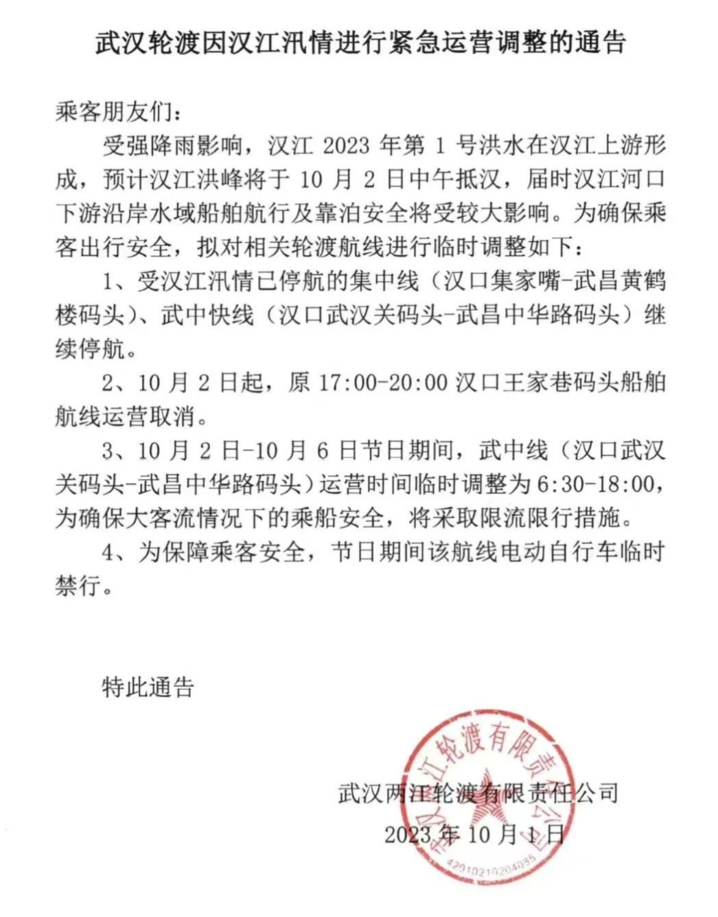 预计汉江洪峰将于10月2日中午抵汉,届时汉江河口下游沿岸水域船舶航行及靠泊安全将受较大影响。为保障乘客安全,10月1日,武汉轮渡发布通告,对相关轮渡航线进行紧急运营调整。