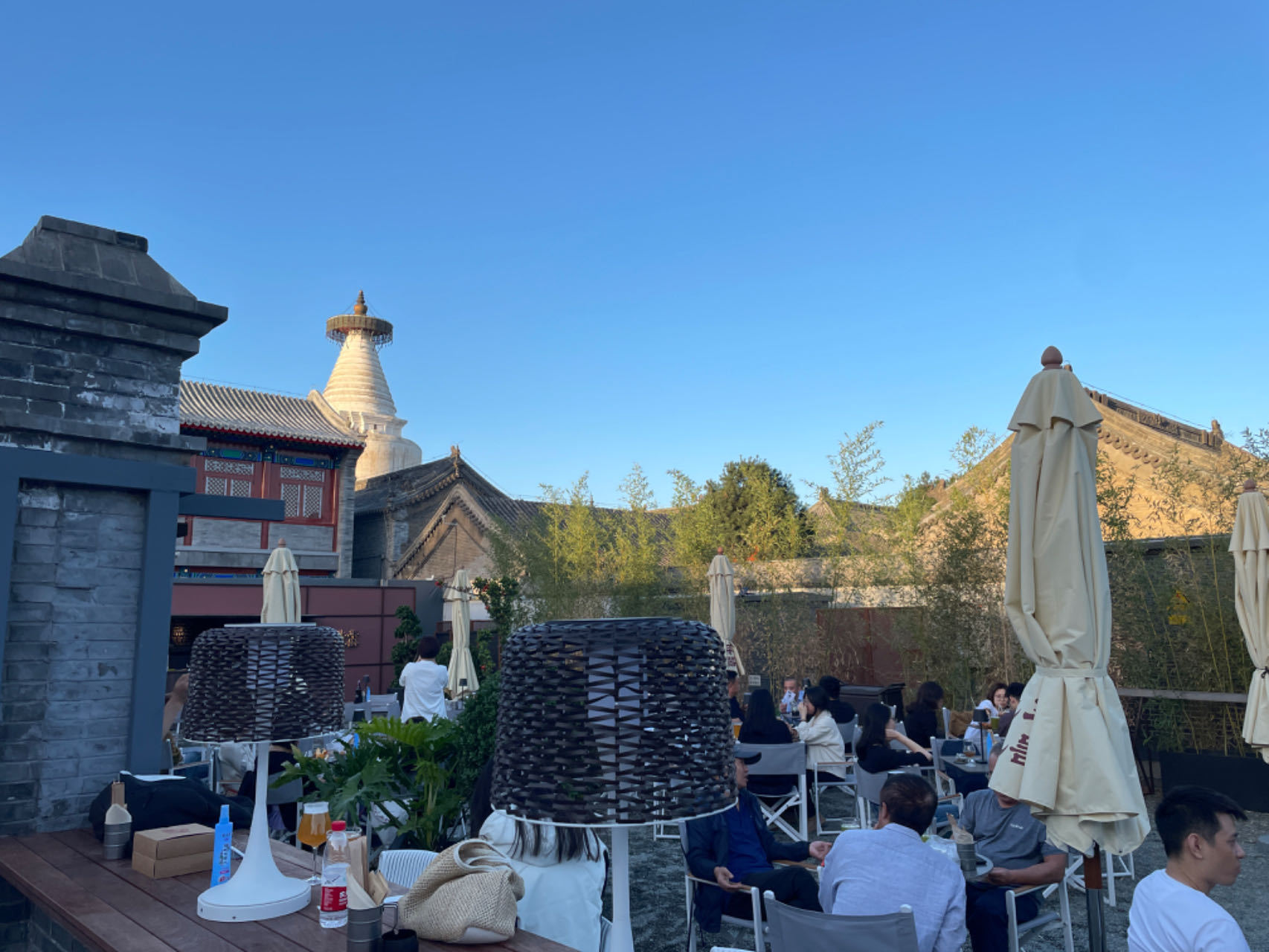 在白塔寺西侧的宫门口东西岔胡同,走100多米,胡同突然变宽,700多年历史的妙应寺白塔出现在眼前,变宽的胡同成了小广场,快闪式的啤酒花园就坐落在这里。游客们走过整洁干净的胡同,望着始建于元代的白塔,喝杯本土自酿啤酒,这是不少游人,甚至本地人都觉得是新鲜的体验。