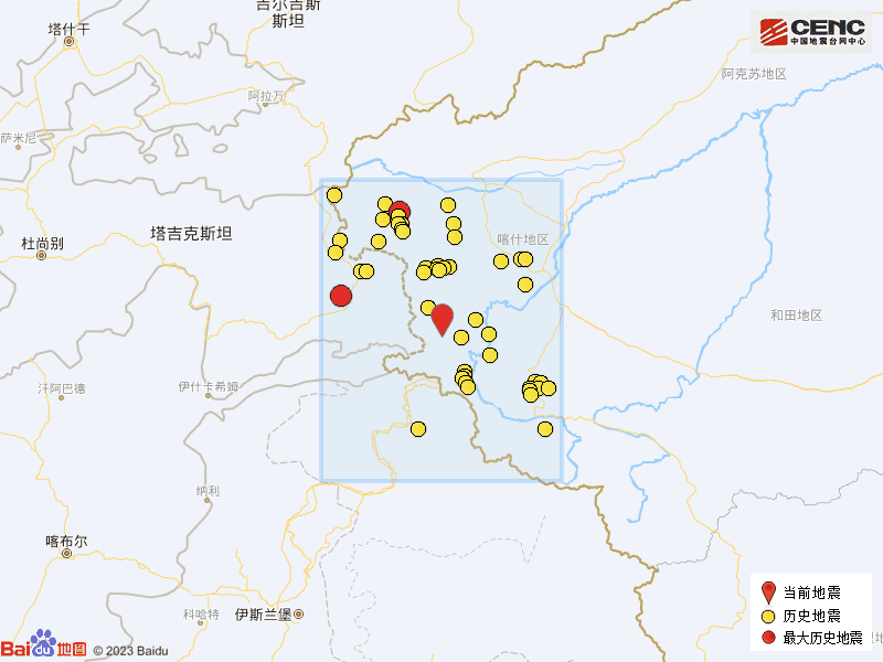 历史地震:根据中国地震台网速报目录,震中周边200公里内近5年来发生3级以上地震共118次,最大地震分别是2020年9月19日在塔吉克斯坦发生的5.2级地震(距离本次震中154公里)和2018年12月20日在新疆克孜勒苏州阿克陶县发生的5.2级地震(距离本次震中178公里),按震级大小前50次历史地震分布如图。