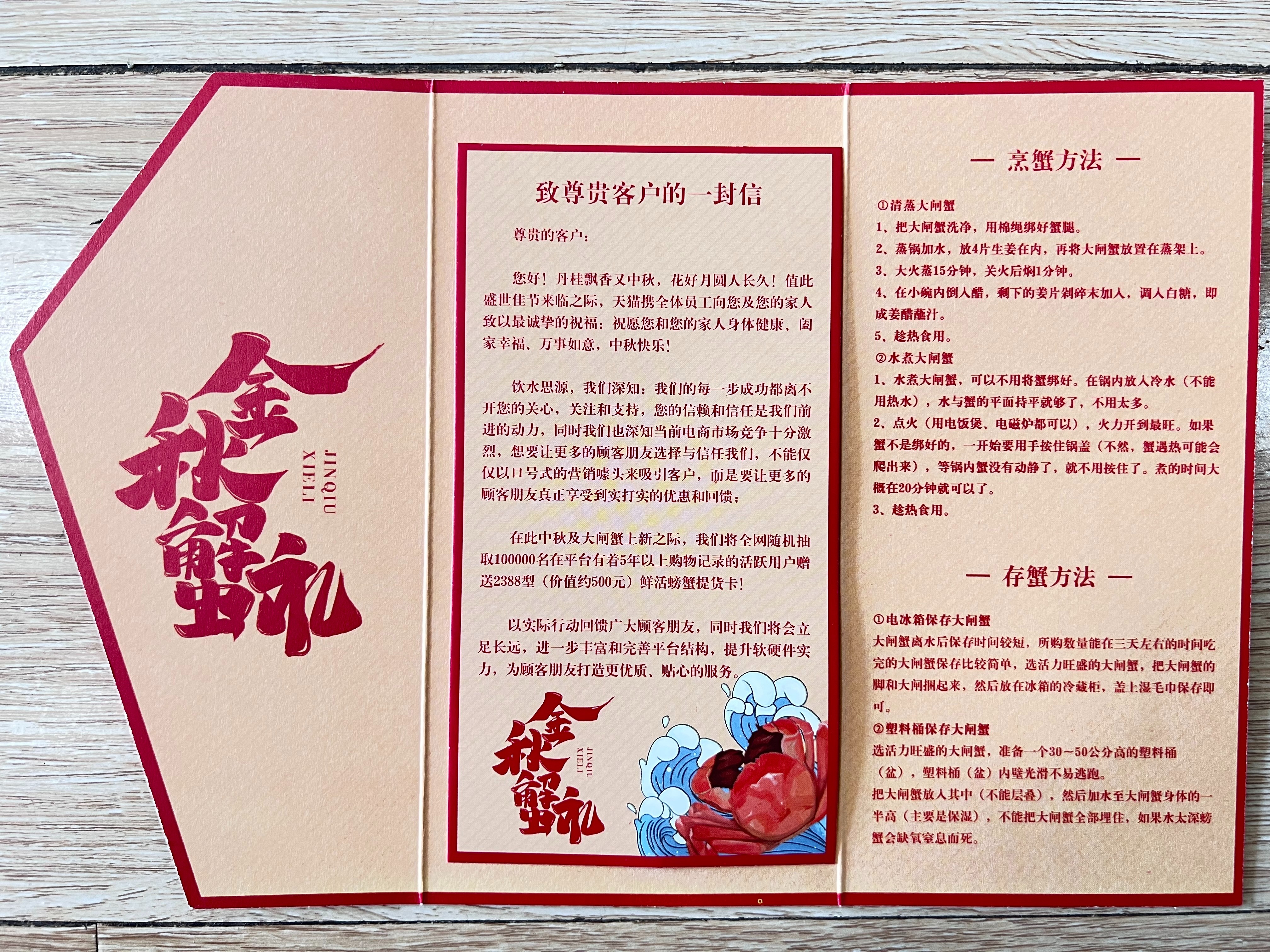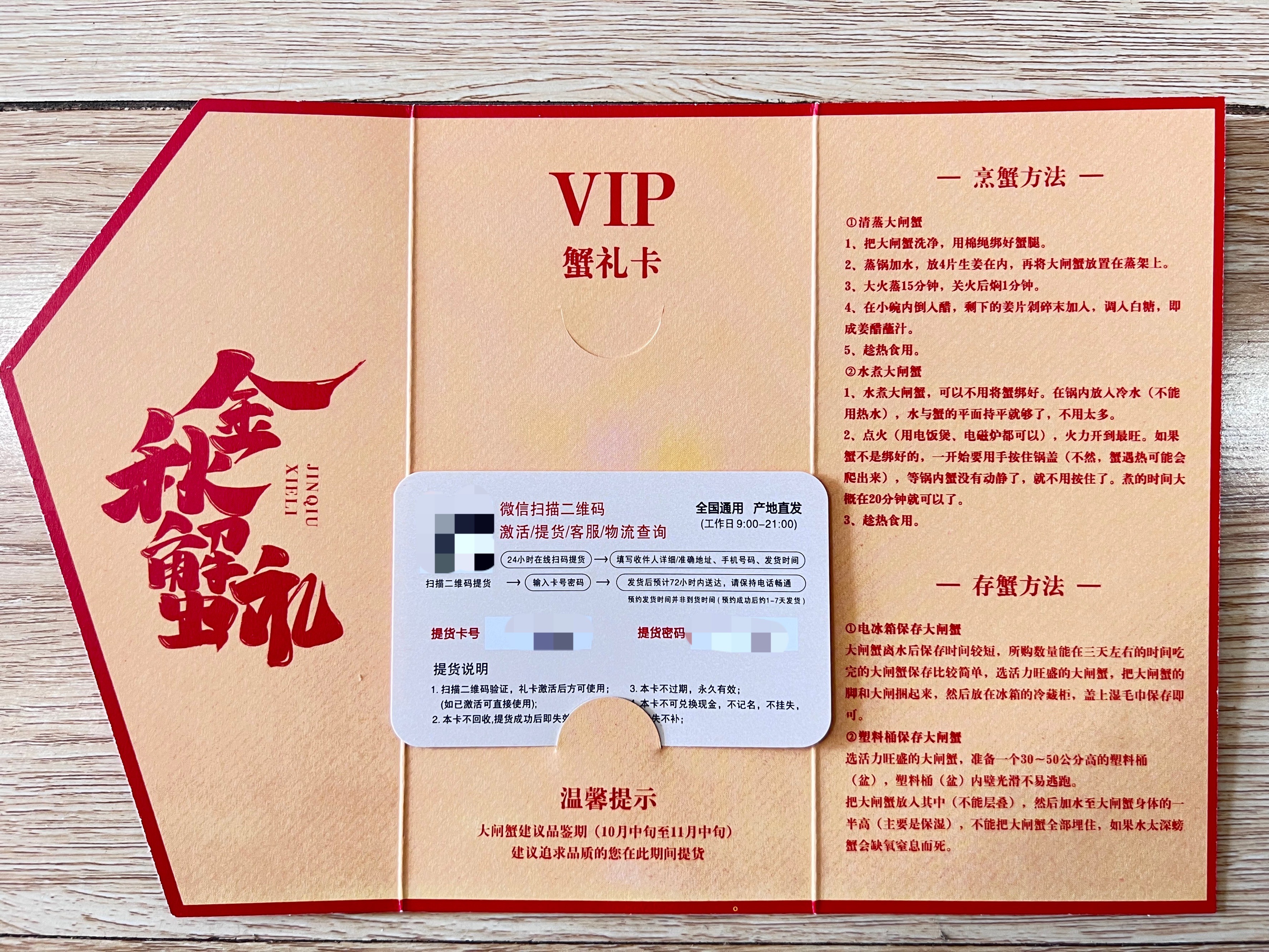“前几天收到了一件广西寄来的快递,寄件人我也不认识。”市民刘女士打开快递,里面是一张蟹卡。蟹卡上并未留有销售公司信息及联系方式,仅有卡号、密码和一个提货二维码。蟹卡还附有一封“致尊贵客户的一封信”,写着:“值此盛世佳节来临之际,携全体员工向您及您的家人致以最诚挚的祝福……在此中秋及大闸蟹上新之际,我们将全网随机抽取100000名在平台有着5年以上购物记录的活跃用户赠送2388型(价值约500元)鲜活螃蟹提货卡。”