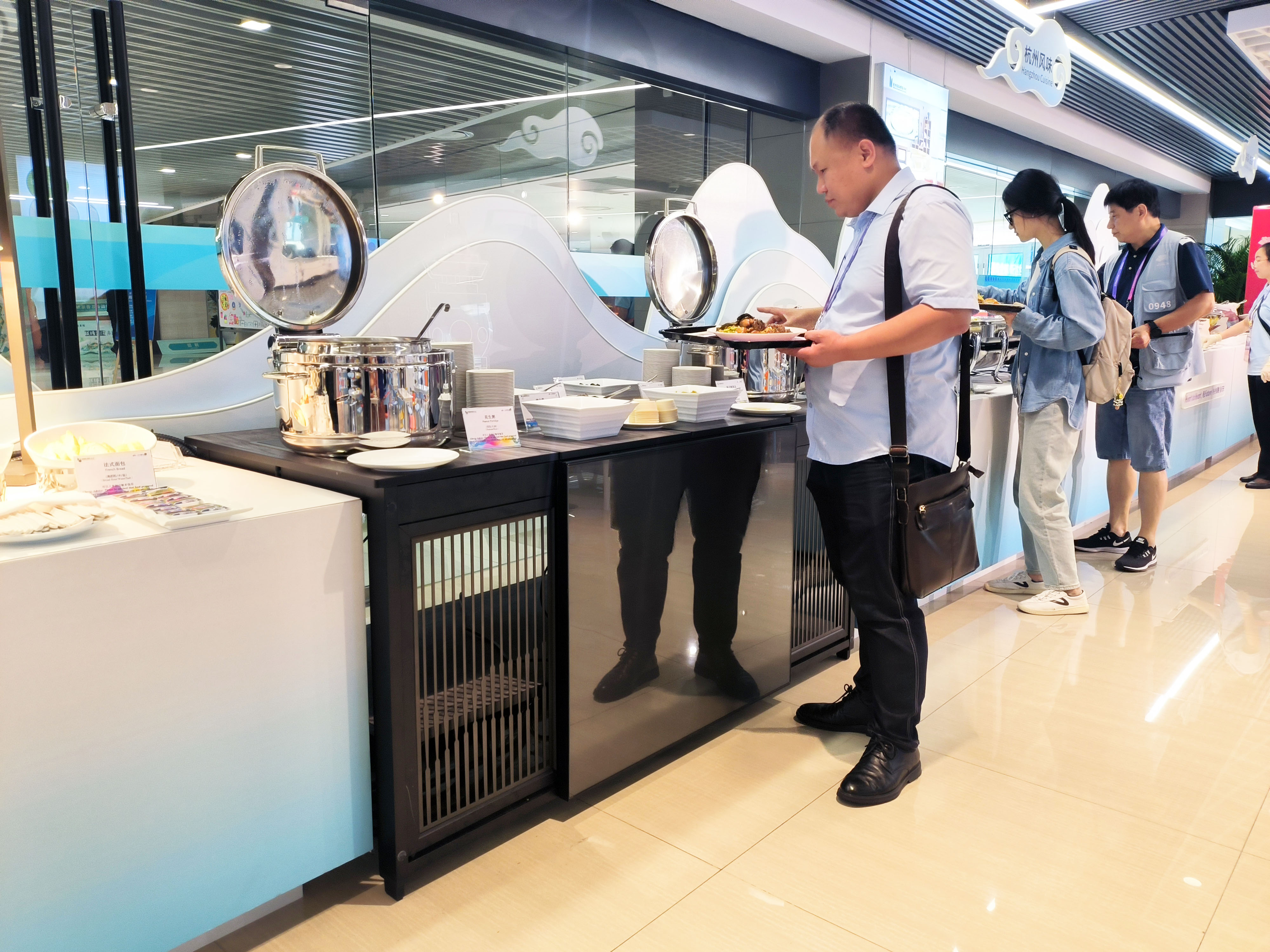 用餐期间,餐厅工作人员会仔细向中外媒体介绍各菜品的名称及用料,记者注意到,部分餐口使用的餐台有别于可降解餐台,而是一款模块化、可移动、颇有中式韵味的布菲车。据工作人员介绍,这款来自深圳德尚(DESON)的布菲车服务于杭州国际博览中心,亚运期间用于自助餐的制作和摆放,让媒体朋友即便因工作原因两三点钟前来,也能享用热餐。