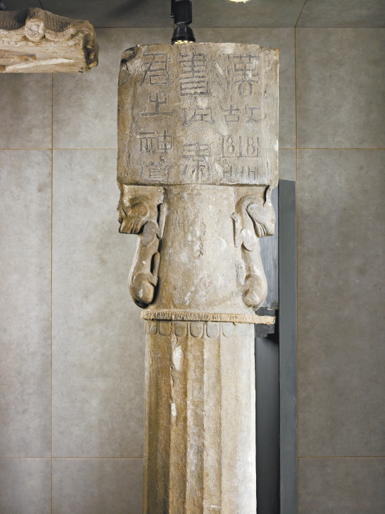 鲜为人知的是,这座蓟城纪念柱,与北京石刻艺术博物馆的镇馆之宝——秦君神道石柱有异曲同工之处。蓟城纪念柱基本复刻了秦君神道石柱从柱础、柱身到石榜的整体造型和装饰细节,在榜文之上添加了阙顶,以回纹装饰将榜文与阙顶连接在一起。秦君神道石柱包括柱础在内高度为2.5米,蓟城纪念柱高度为10米,等比放大数倍,且别出心裁地将成对的石柱变成了一座独立的纪念柱。