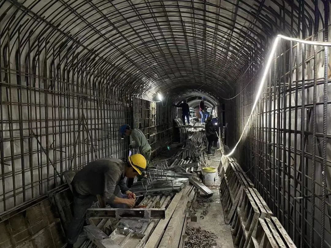 一套“组合拳”下来,工程仅用时20天就具备了竖井开挖条件,而且实现了17口竖井同时平行施工。建设者们并没有因此放松,而是为推动项目驶入快车道继续集思广益。他们采用全断面注浆方式稳定开挖土层,为隧道开挖的顺利掘进创造了条件;提高初衬的喷射混凝土标号,增加混凝土早期强度,为推进掘进速度提供了安全保障;深入研究工序衔接及机械配合,全面提升了施工进度;与设计沟通,将防水材料由高分子自粘胶膜防水卷材改为EVA防水板,节省了防水的施工周期。尤其是在汛期,每个作业面全天24小时4个班组不间断施工,最高峰时全线工人达762人。