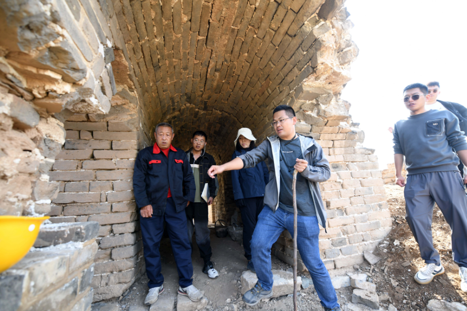 353号敌台最大的险情,出现在过道西头的拱券部位:拱券南侧的券柱以及整个敌台西侧的基础已经塌了,失去一大半支撑,导致整个券顶向西倾斜,券顶中部还被拉开了一大一小两条裂缝。“这种情况必须马上抢险,否则存在进一步坍塌乃至灭失的可能。”密云区文物所负责人介绍。