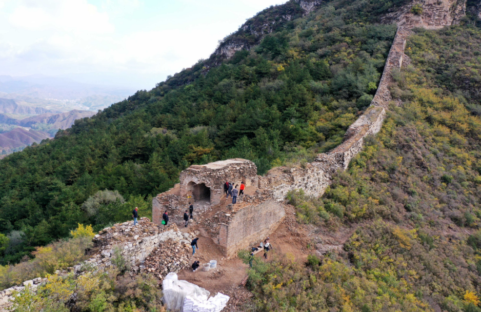 在连绵起伏的山脊上,一条灰白色的砖石长龙匍匐向前,一座又一座敌台高耸其间。10月8日,记者跟随工作人员来到位于古北口镇的卧虎山长城。从山脚下开始爬,翻过一道道山梁,大约50分钟后,一行人气喘吁吁地来到长城脚下。