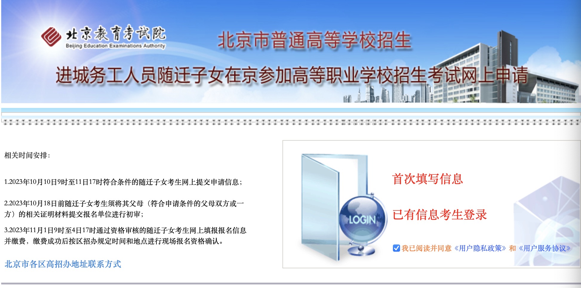 记者注意到,系统分为两个入口:首次填写信息和已有信息考生登录。点击“首次填写信息”后,系统将自动弹出申请者须满足的申请条件,即:进城务工人员持有在有效期内的北京市居住证、居住登记卡或工作居住证;在京有合法稳定住所;在京有合法稳定职业已满6年;在京连续缴纳社会保险中的基本养老保险或基本医疗保险已满6年;随迁子女还要具有本市学籍且已在京高中连续就读3年。之后,考生须输入姓名、性别等基本信息,并设置登录密码。已有信息的考生可输入身份证号、密码、验证码直接登录系统。