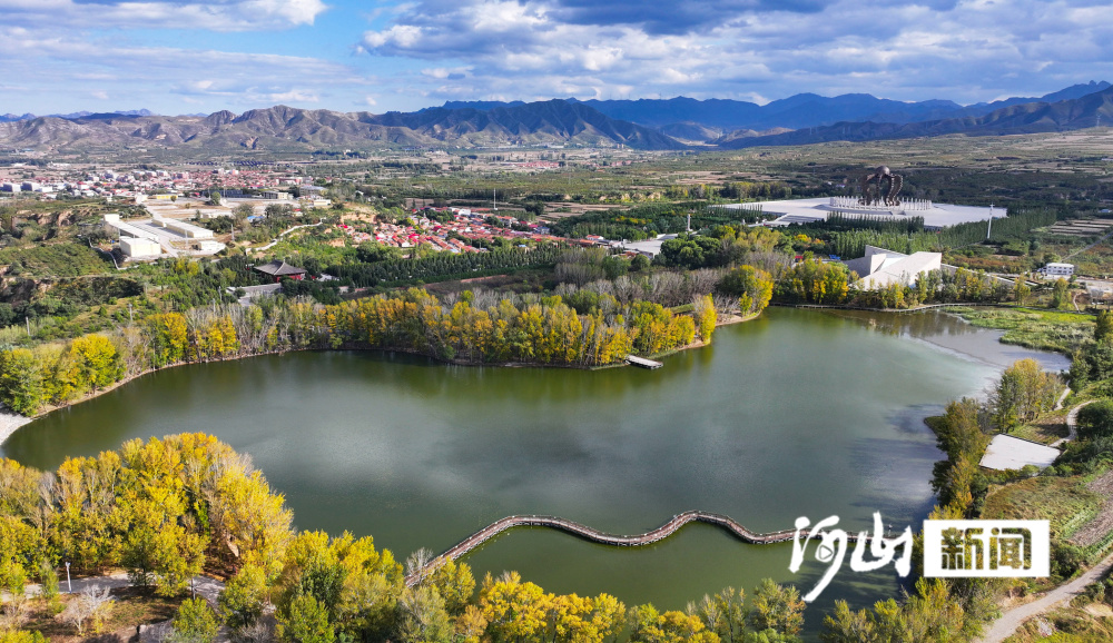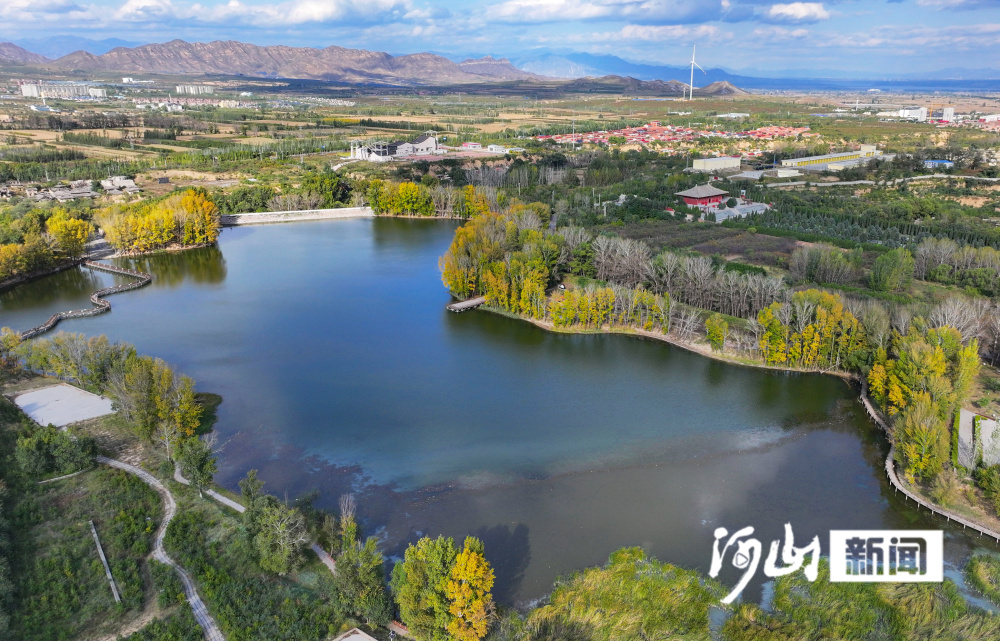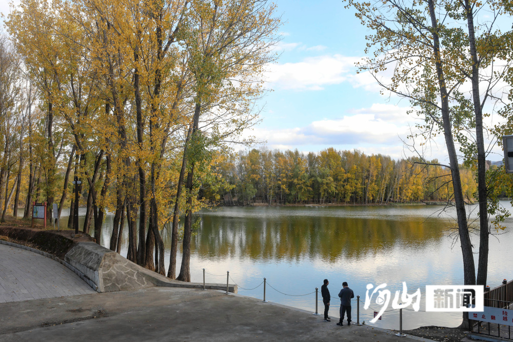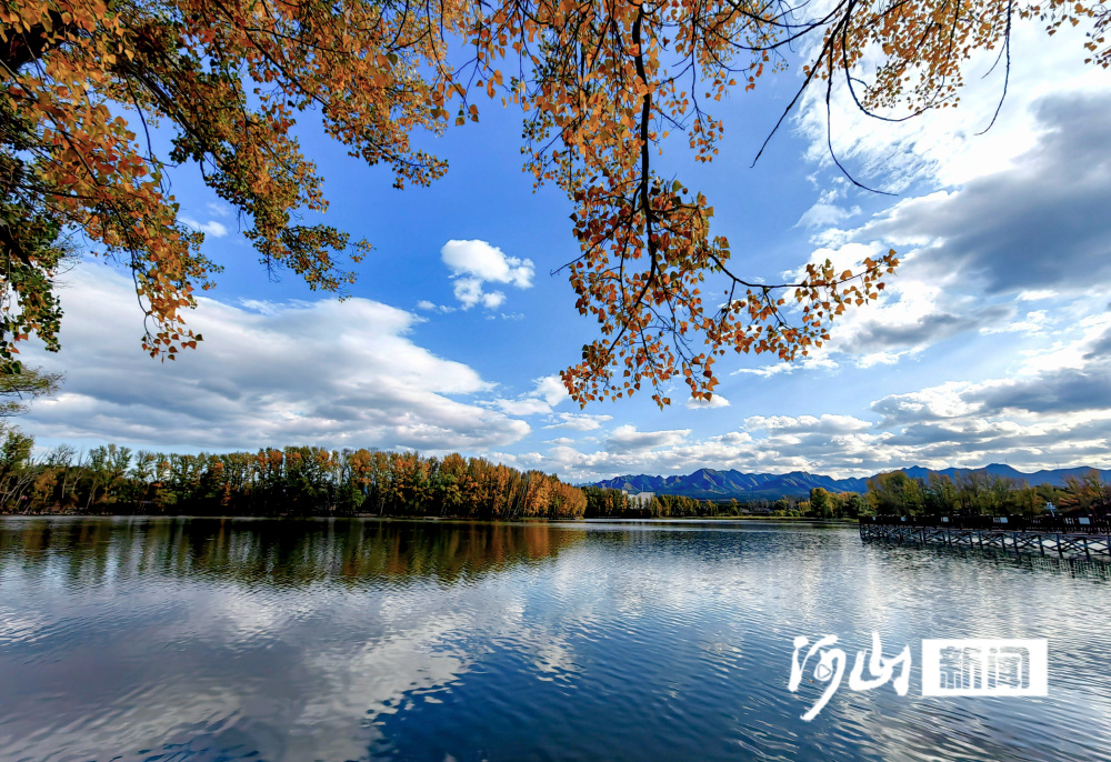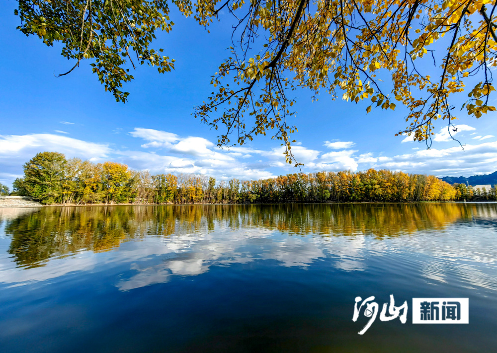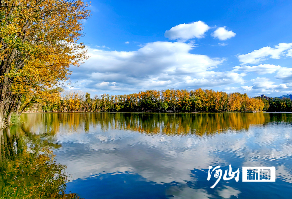 深秋时节,位于张家口市涿鹿县中华三祖堂与黄帝城遗址间的轩辕湖,碧波荡漾,蓝天、白云、金黄色的树木倒映湖面,构成一幅山水相连、水天一色的醉人美景图。(河山新闻记者 武殿森 通讯员 朱文君)