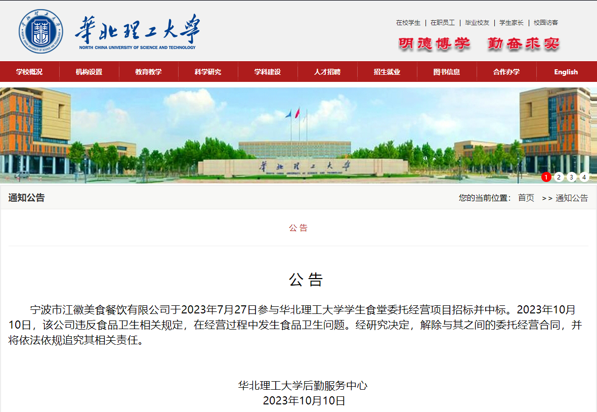 宁波市江徽美食餐饮有限公司于2023年7月27日参与华北理工大学学生食堂委托经营项目招标并中标。2023年10月10日,该公司违反食品卫生相关规定,在经营过程中发生食品卫生问题。经研究决定,解除与其之间的委托经营合同,并将依法依规追究其相关责任。