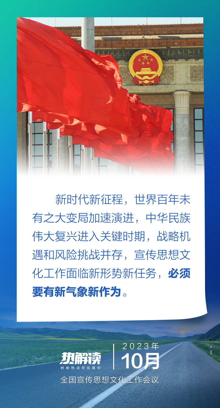 这次全国宣传思想文化工作会议要求,持续加强对习近平文化思想的学习、研究、阐释,并自觉贯彻落实到宣传思想文化工作各方面和全过程,同时也对推动各项工作落地见效提出明确要求:从坚持不懈用习近平新时代中国特色社会主义思想凝心铸魂,到巩固壮大奋进新时代的主流思想舆论;从广泛践行社会主义核心价值观,到促进文化事业和文化产业繁荣发展;从加强和改进对外宣传工作,到坚决有效防范化解意识形态风险。每一项都要以钉钉子精神落到实处,每一项都要展现新气象新作为。