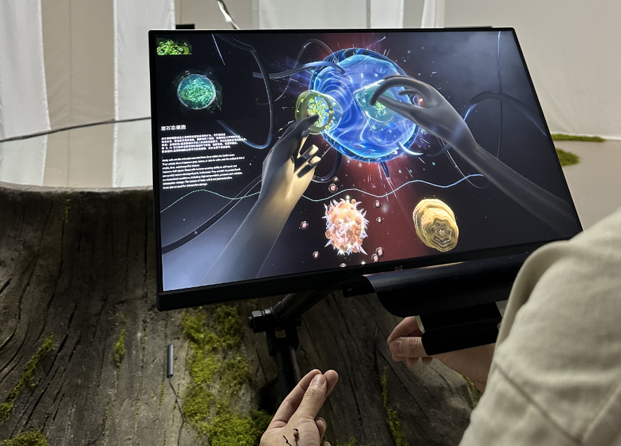 “这是亚洲最大规模MR数字艺术展,集混合现实、沉浸式、交互式为一体,为游客打造了超级沉浸式互动震撼体验。”在展厅入口处,游客可自由选择进入“意识种子库”“造物主”“新月空间”“坠入虚无”“未知”“创造”6个虚实空间,每个虚实空间都绽放着科技与艺术相结合的特殊魅力。走进“坠入虚无”空间,绚丽的激光艺术装置,让游客“坠入”未来空间;而“未知”空间中,行走每一步都踩在自己在宇宙中的位置上;“创造”空间里游客最多,人们在一个黑色的巨型装置面前,双手操作空中键盘进行绘画和书法创作,点击完成,作品立即被MR眼镜上的照相机自动拍照保存下来……