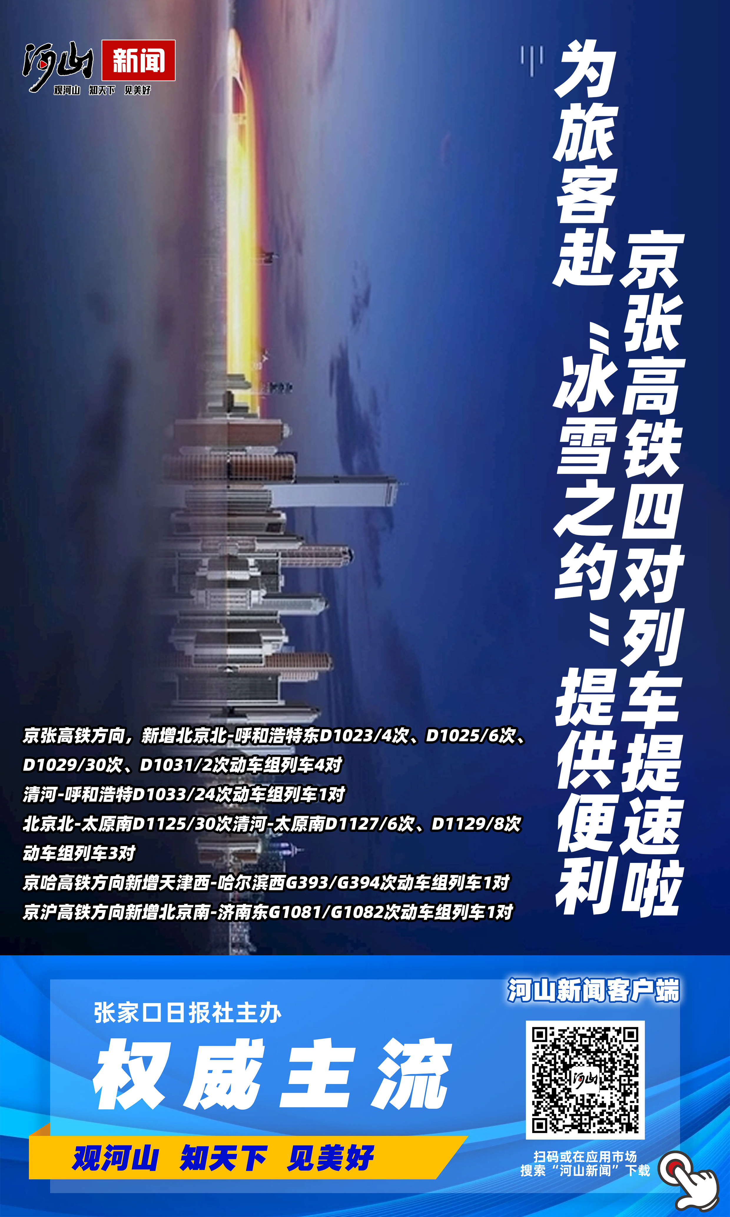 客运方面,京张高铁、京哈高铁、京沪高铁新增动车组列车10对,京张高铁4对动车组列车等级改为高速动车组列车,列车时速进一步提升,为广大旅客赴“冰雪之约”提供便利。京张高铁方向,新增北京北-呼和浩特东D1023/4次、D1025/6次、D1029/30次、D1031/2次动车组列车4对,清河-呼和浩特D1033/24次动车组列车1对,北京北-太原南D1125/30次及清河-太原南D1127/6次、D1129/8次动车组列车3对。京哈高铁方向新增天津西-哈尔滨西G393/G394次动车组列车1对。京沪高铁方向新增北京南-济南东G1081/G1082次动车组列车1对。