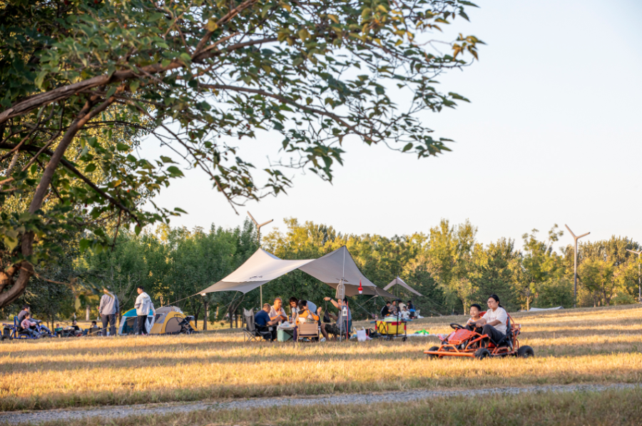 十一黄金周最后一天,记者踏足此处,眼前是一幅柔和温馨的图景:毛茸茸的草颇有野趣,几株杨柳槐洒下浓荫。很多人支起帐篷和天幕,摆上蛋卷桌,中年人凑在一块儿聊天,小朋友们到处疯跑。还有爱拍照的女孩子带来几枝粉玫瑰,插在桌上的陶瓶里。