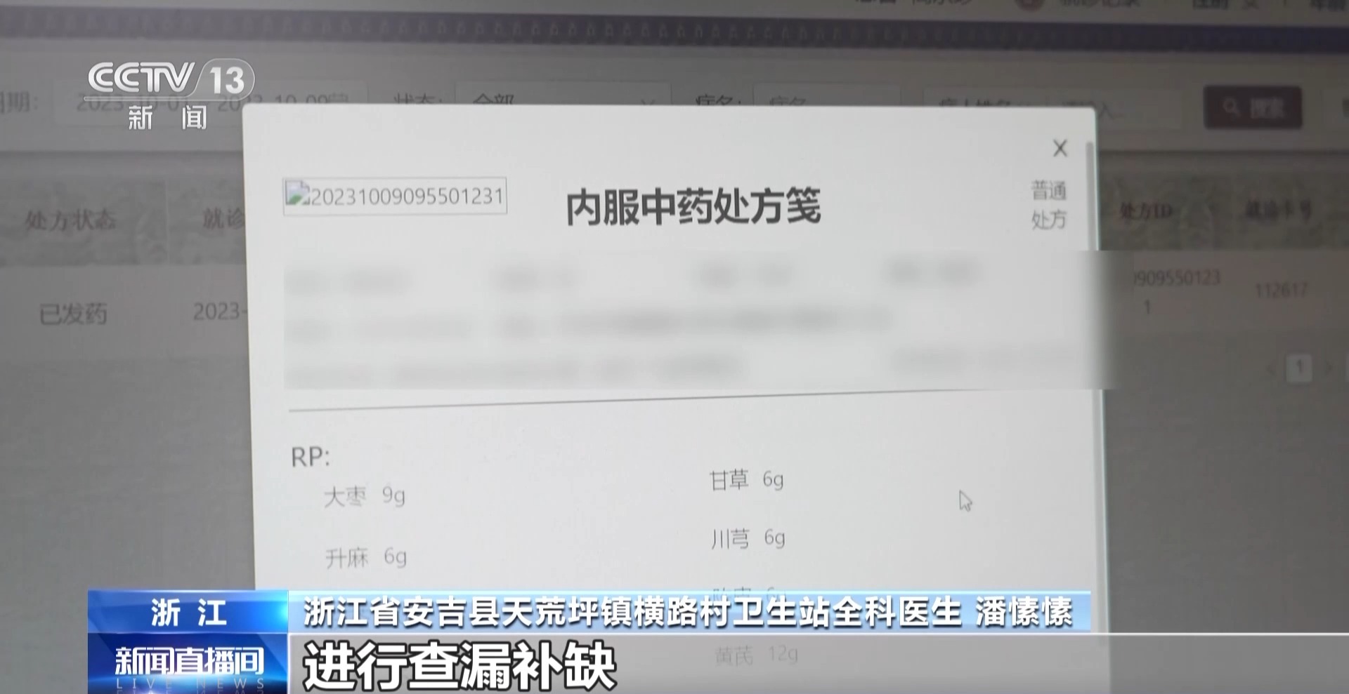 一大早,高水珍老人就来到村里的卫生室。医生一边把脉问诊,一边在电脑上勾选相应的症状和治疗方向。检查结束,一张中草药处方也自动生成了。根据高水珍老人的个人情况,医生再对处方稍加修改,就发送给县中医医院药房,等待中药师审核。