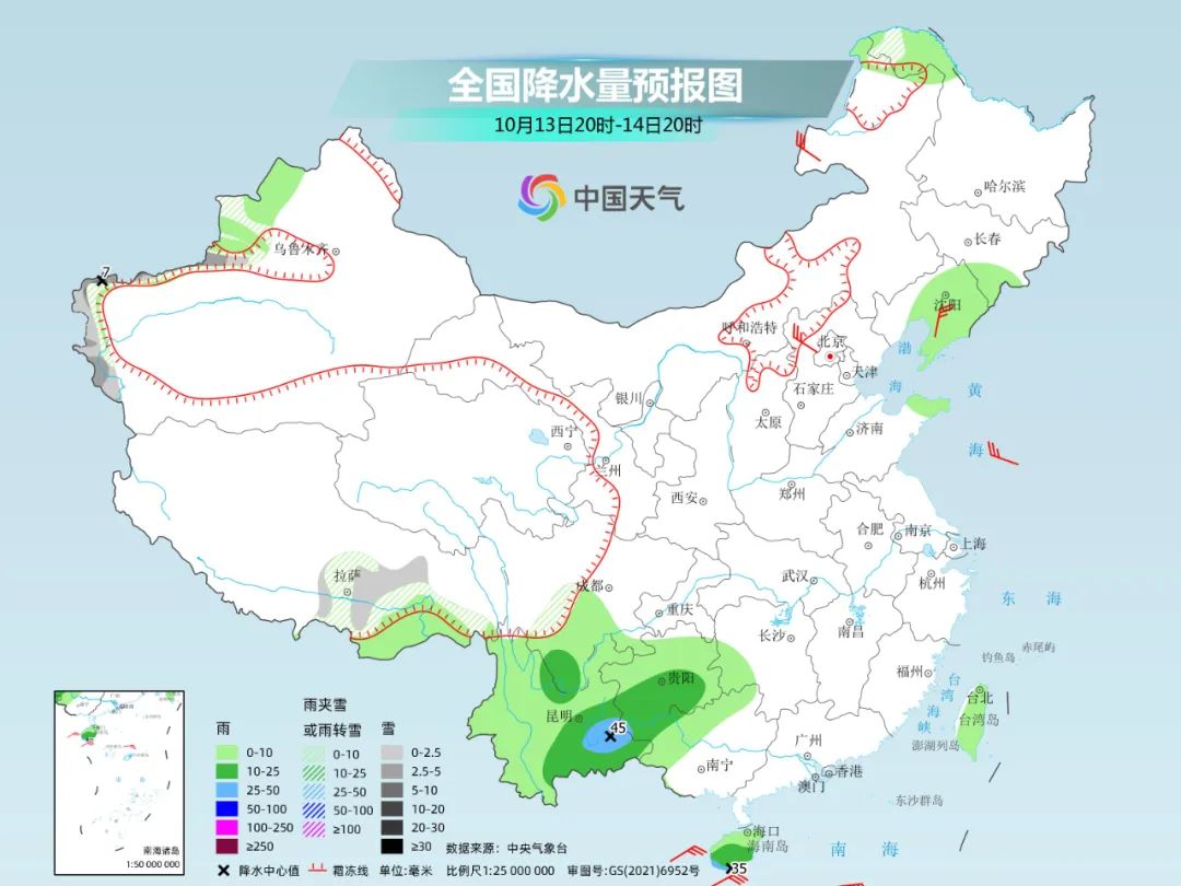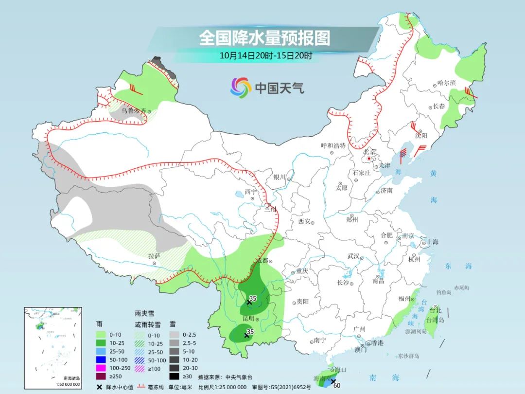●云南及其周边地区阴雨频繁。云贵一带位于副热带高压边缘,北边又有冷空气南下,形成云贵准静止锋,降雨频繁。预计本周末这一带雨势减弱,主要以小雨为主,不过云南南部明天仍然会有中到大雨,需警惕持续降雨和局地强降雨可能引发的次生灾害。15日起云贵一带降雨逐渐减弱。
