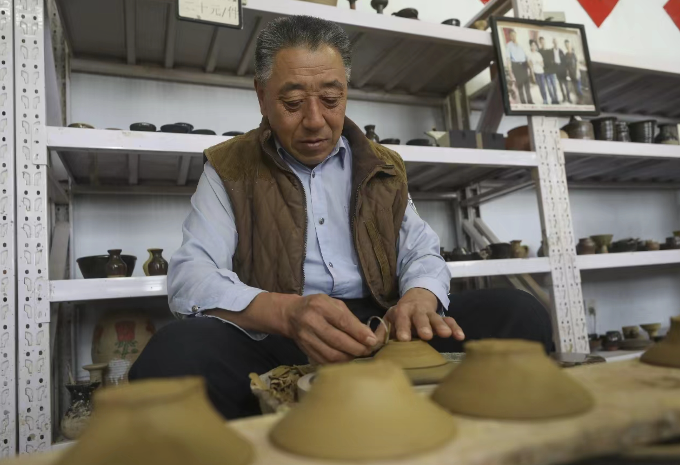 大院内设有民俗博物馆,我们造访时恰遇到制陶世家“碗窑”第七代传人侯玉文,一块块泥坯在他手中,随着陶轮旋转,经过撑肚、立膀、挽沿等工序,两三分钟便成型。只一把旋刀,7只小碟,丝毫不差。亲眼目睹后,皆赞叹工匠精神之博大。