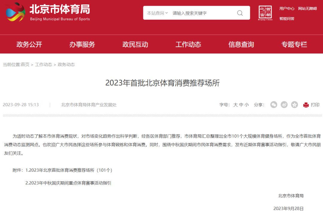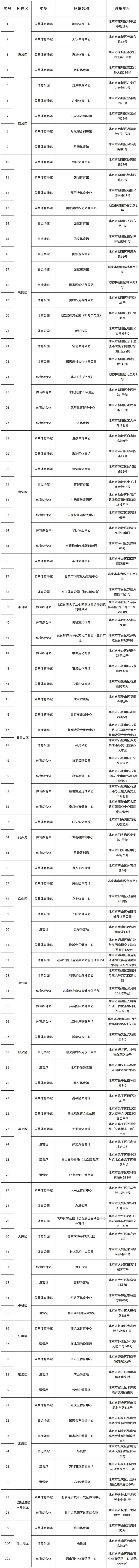 2023年北京首批体育消费推荐场所(101个)