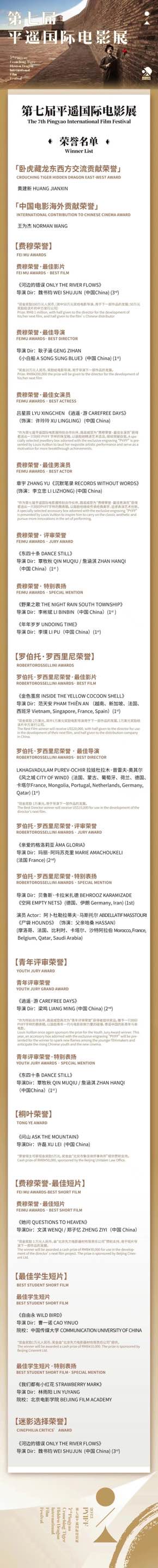 10月16日晚,第七届平遥国际电影展荣誉名单公布,魏书钧执导、朱一龙主演的影片《河边的错误》获得“费穆荣誉·最佳影片”。电影《小白船》导演耿子涵获得“费穆荣誉·最佳导演”。《沉默笔录》主演章宇和《逍遥·游》主演吕星辰分别当选费穆荣誉·最佳男女演员。