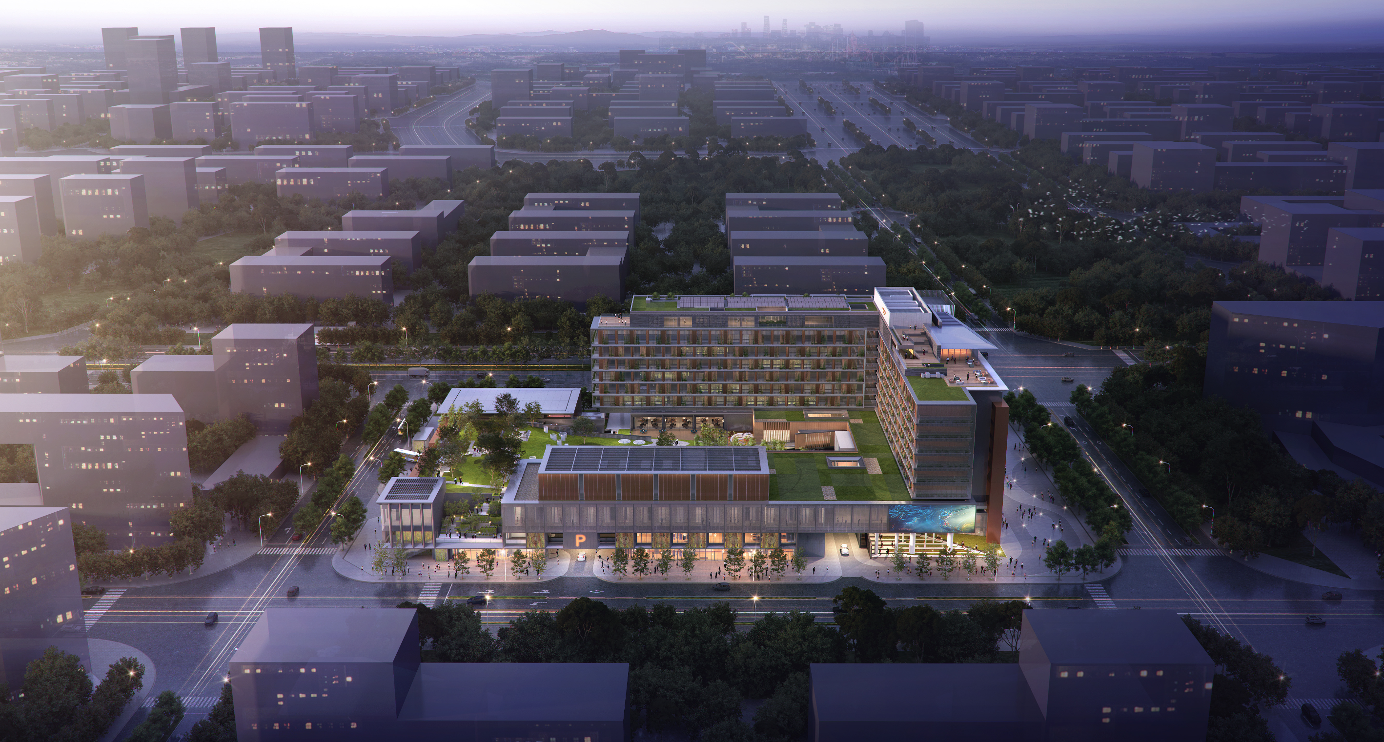 上盖花园以上的四至十层,也即项目东侧、北侧的高层建筑为五星级酒店,拥有客房338间,东侧客房的屋顶设置了开放式平台空间,引入花园酒吧业态,方便人们观景休闲。北侧楼顶则是铺设了172块单晶硅光伏发电组件,总装机容量为94.6千瓦时,采用“自发自用、余电上网、不设储能”的模式,预计年发电量可达9.73万度,每年可减少二氧化碳排放约81吨。