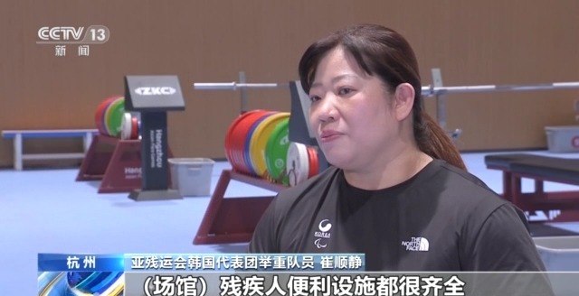 亚残运会韩国代表团举重队员 崔顺静:场馆的残疾人便利设施都很齐全,比想象中的还要贴心,轮椅可以使用的面积很大,通道非常宽敞,走路也很方便,给我留下了深刻的印象。