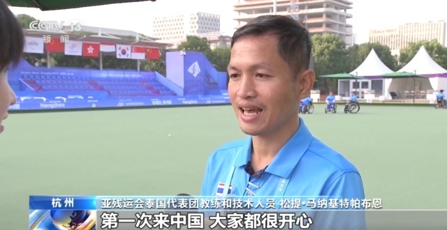 亚残运会泰国代表团教练和技术人员 松提·马纳基特帕布恩:第一次来中国,大家都很开心,志愿者很热情接待我们。场地标准很高,也很漂亮,我们希望能保持好状态,这次亚残运会拿个奖牌回去。