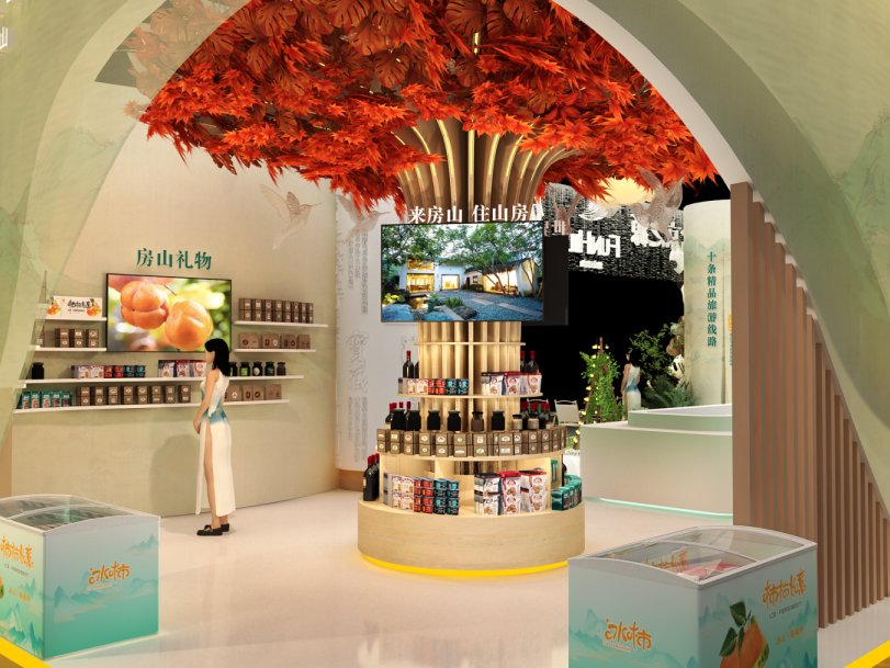 走进产品展示区,硕大的枫叶树展台喜迎八方来客,寓意红红火火,现场摆放着房山特色红酒、农副产品、金蒸蒸的面点,道口烧鸡等美食,更有超多好玩有趣的非遗互动体验项目等您来!