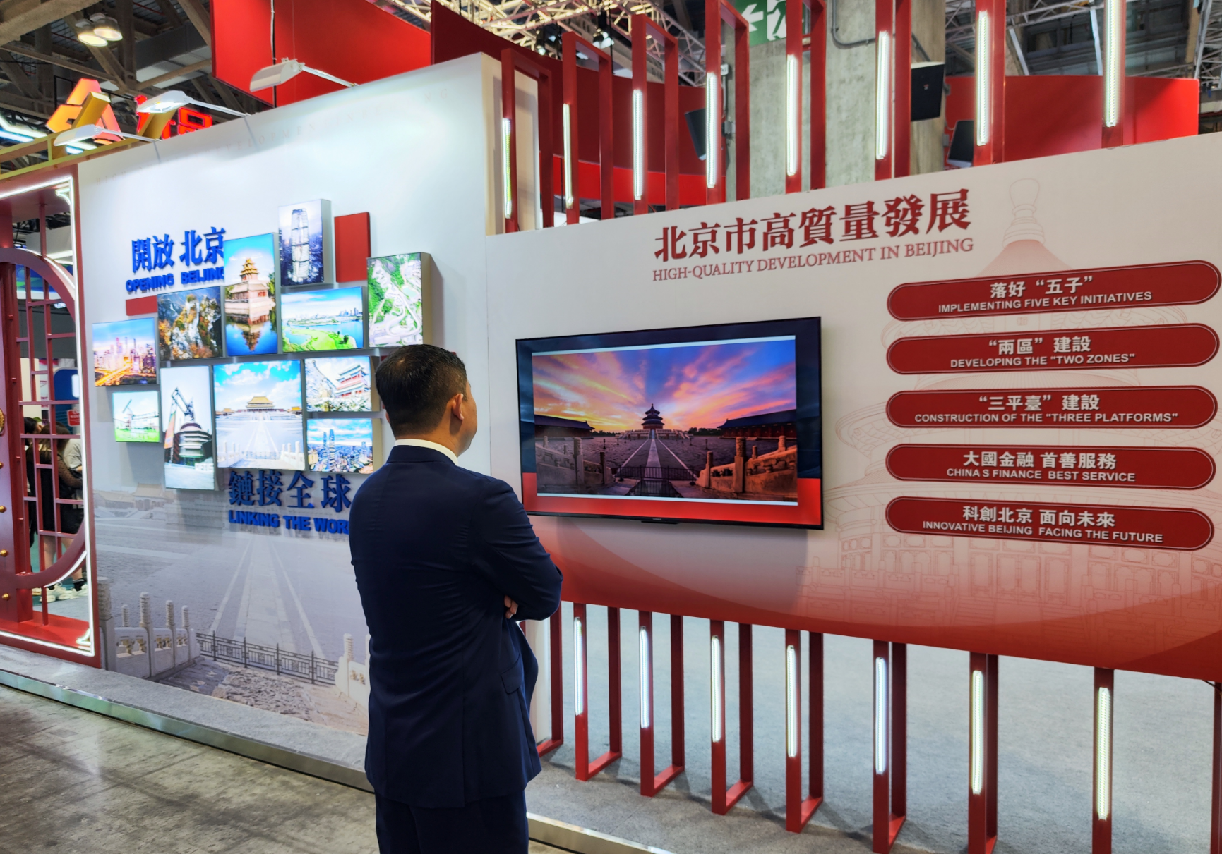 占地400余平方米的北京馆,整体以城墙红为主色调,点缀天坛等代表性建筑图案,勾勒出北京金秋的宜人景象,渲染出浓浓的京味儿,成为今年MIF展最受欢迎的打卡点之一。展会期间,北京馆以“魅力北京 开放昌平”为主题,举办“北京主题日”推介活动以及一系列展览展示、对接洽谈活动,以服务业扩大开放、科技、金融及大健康产业为重点,集中展示北京市坚持“五子联动”推动首都高质量发展的成果,重点推介昌平区开放发展成果及产业特色。
