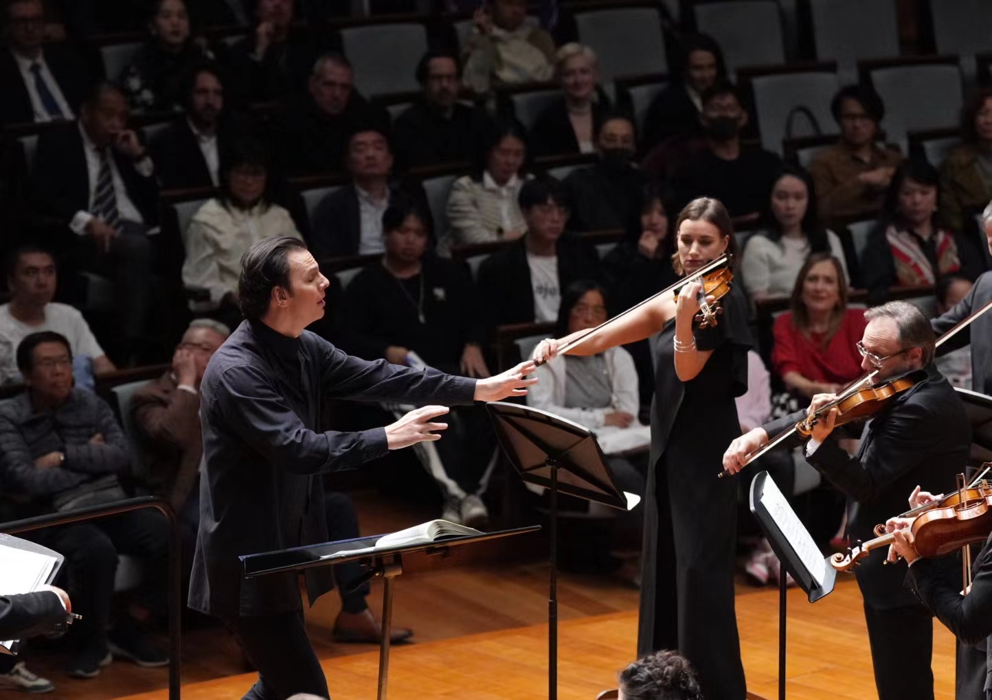 还未等库伦齐斯与音乐永恒乐团奏响第一声,观众便可以感受到他们的与众不同。除了大提琴、竖琴等少数乐器,乐手们全员站立,库伦齐斯随后在期待已久的掌声中上场。初到中国,他们呈现了两场俄式音乐盛宴,10月21日晚,里姆斯基-柯萨科夫《天方夜谭》、拉赫玛尼诺夫《第二交响曲》率先上演。音乐永恒乐团的声音与大多数现代交响乐团追求的圆融和谐的声效显然不同,《天方夜谭》中,各声部演奏家仿佛化作凌厉鲜明的色块,在不同音乐织体之间碰撞,而一切又显然处于音乐律动框架之内,剧烈的戏剧冲突时常能带来令人大脑短暂空白般的强烈刺激,仔细听来,细节上的精雕细琢又耐人寻味。
