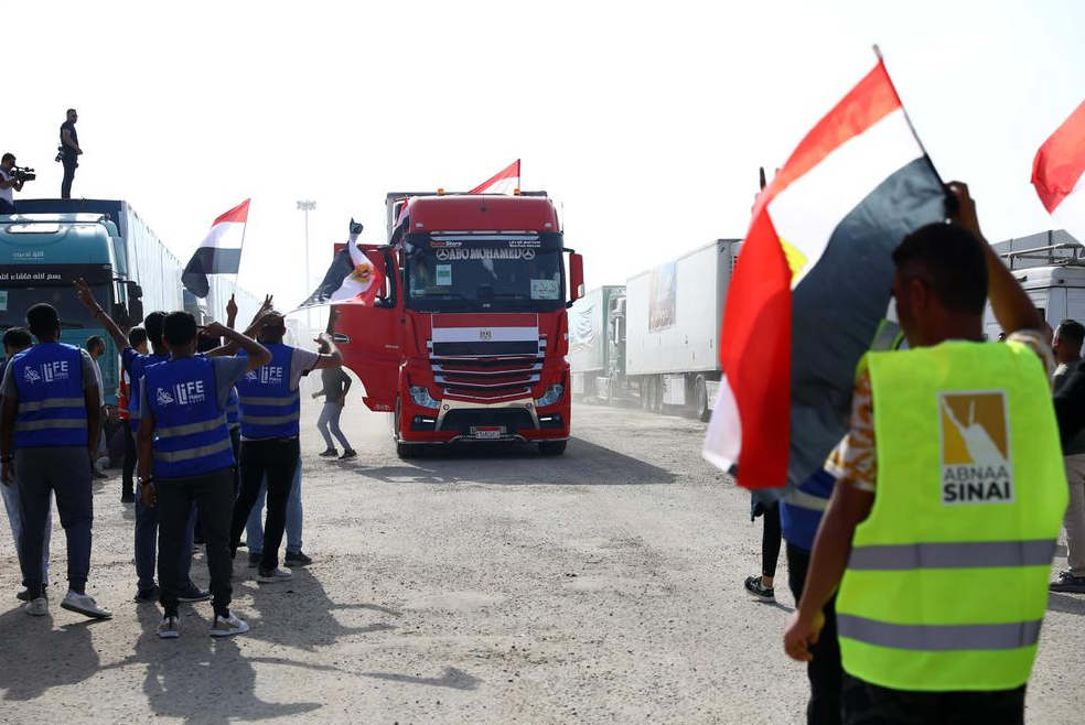 17辆装载人道救援物资的卡车22日从拉法口岸埃及一侧进入加沙地带。这是21日以来第二批人道救援物资从拉法口岸运往加沙地带。