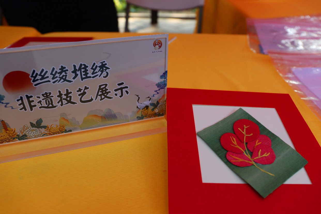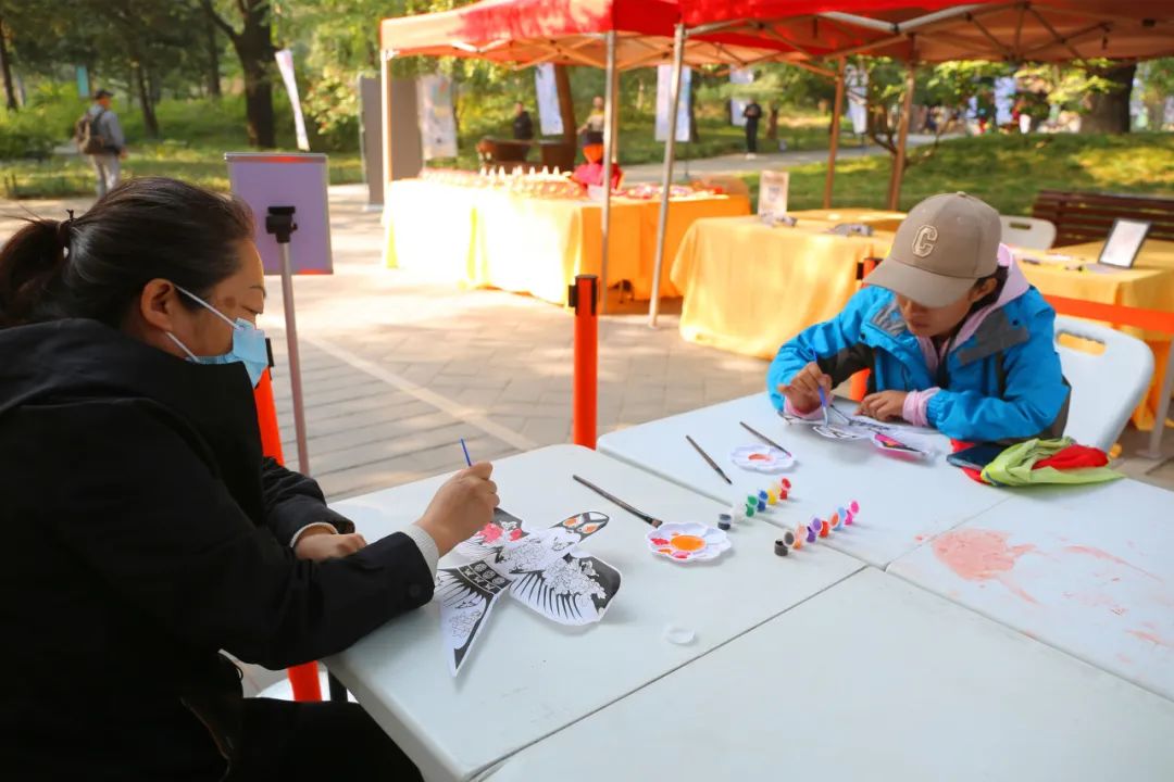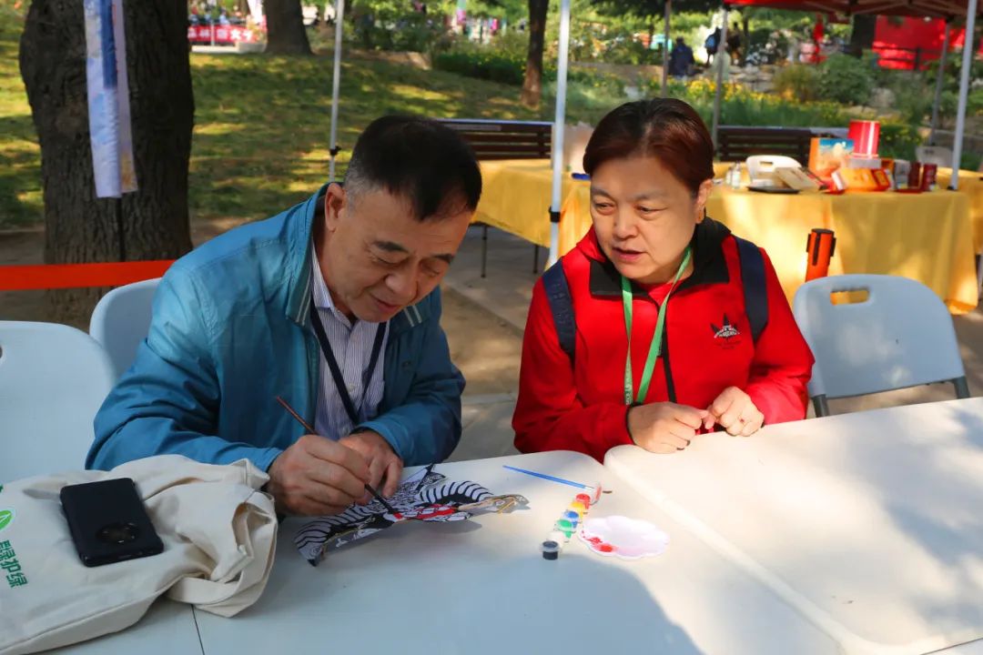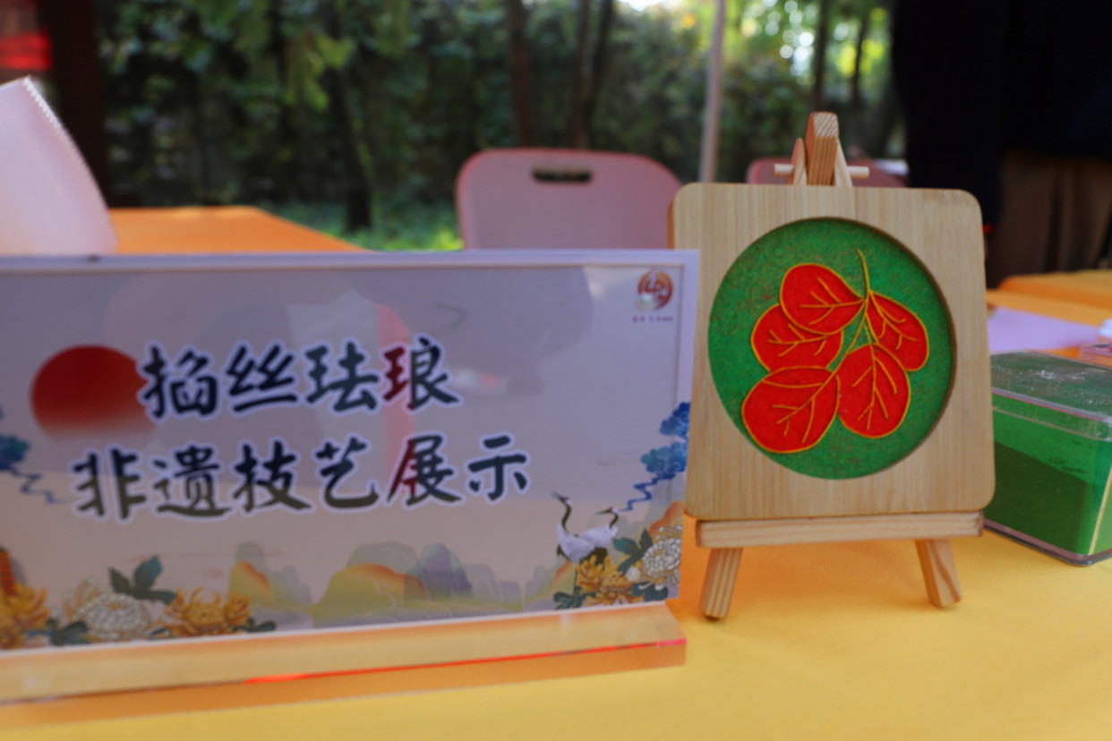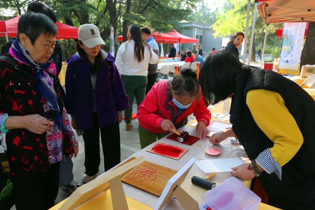 今天在柿子林区域也十分热闹,非遗市集“香山过重阳 漫游赏非遗”开市,有掐丝珐琅、印染、木拓、鼻烟壶、皮影戏、北京毛猴、风车、风筝、螺钿镶嵌、丝绫堆绣等非遗技艺在这里进行展示。非遗技师们特别结合香山红叶造型,设计了木拓红叶、内画红叶、丝绫堆绣红叶、掐丝珐琅红叶等多种不同的红叶“制法”,供中老年游客现场体验,并且可以将属于自己的那份特殊的“红叶”纪念带回家。