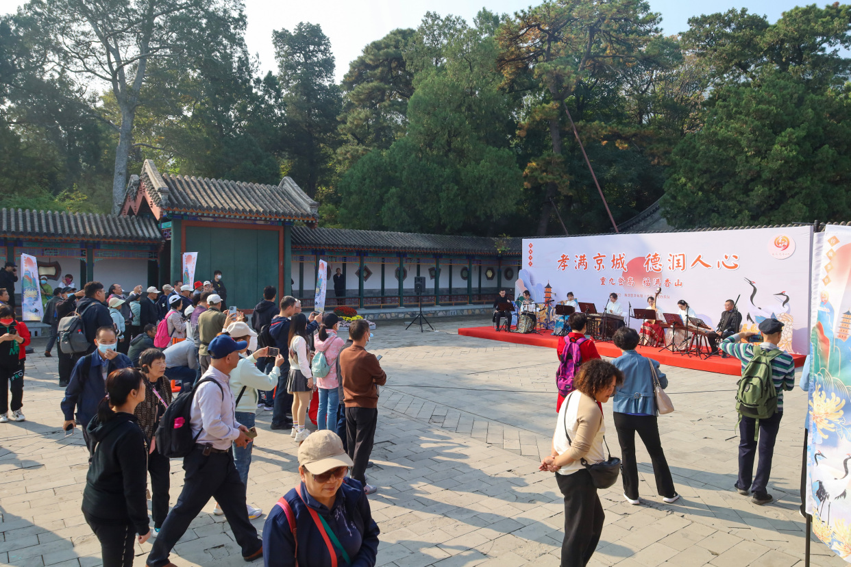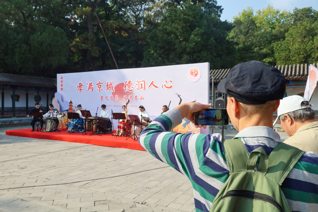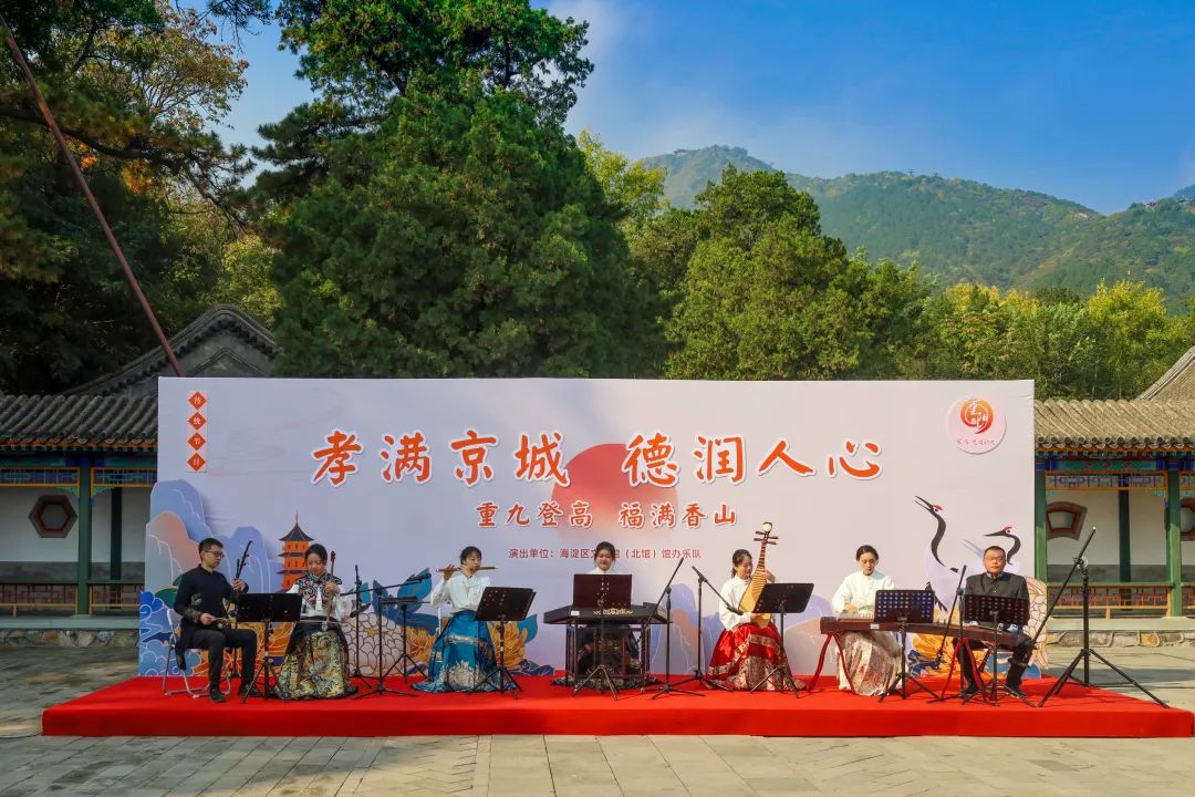 作为香山公园重阳节一项保留项目——重阳文艺演出,今天依然如约在致远斋内上演。今年的演出以“喜遇重阳”为主题,以民乐演奏为主,通过演奏彩云追月、水乡情韵、良宵、茉莉花等传统经典民乐曲目,为现场和通过微博直播线上观看的游客朋友送上重阳节的祝福。