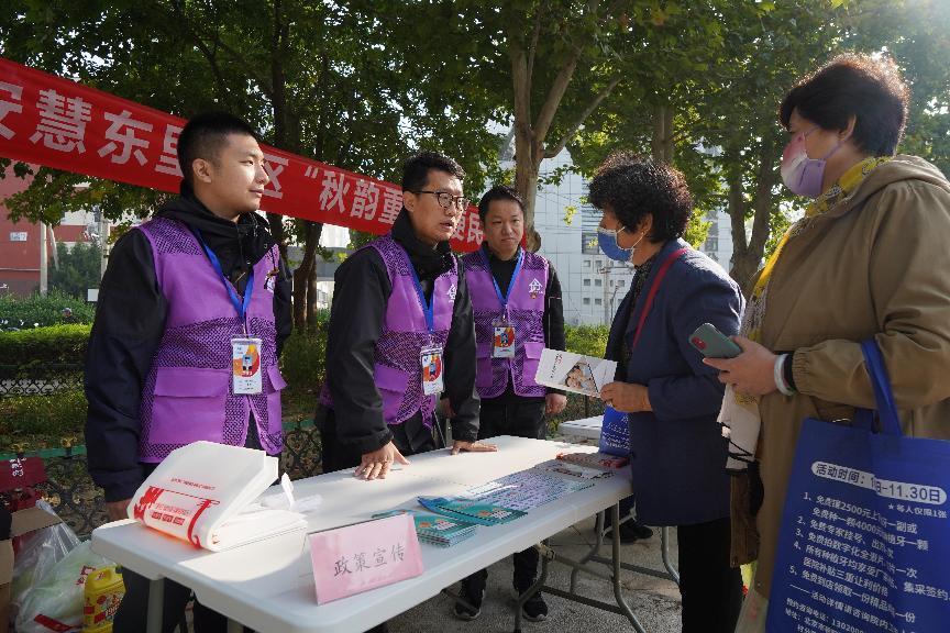 10月24日上午,北四环外徽商银行广场人群熙攘,热闹非凡,朝阳区大屯街道安慧东里社区“秋韵重阳”便民市集邻里节活动在这里举办。