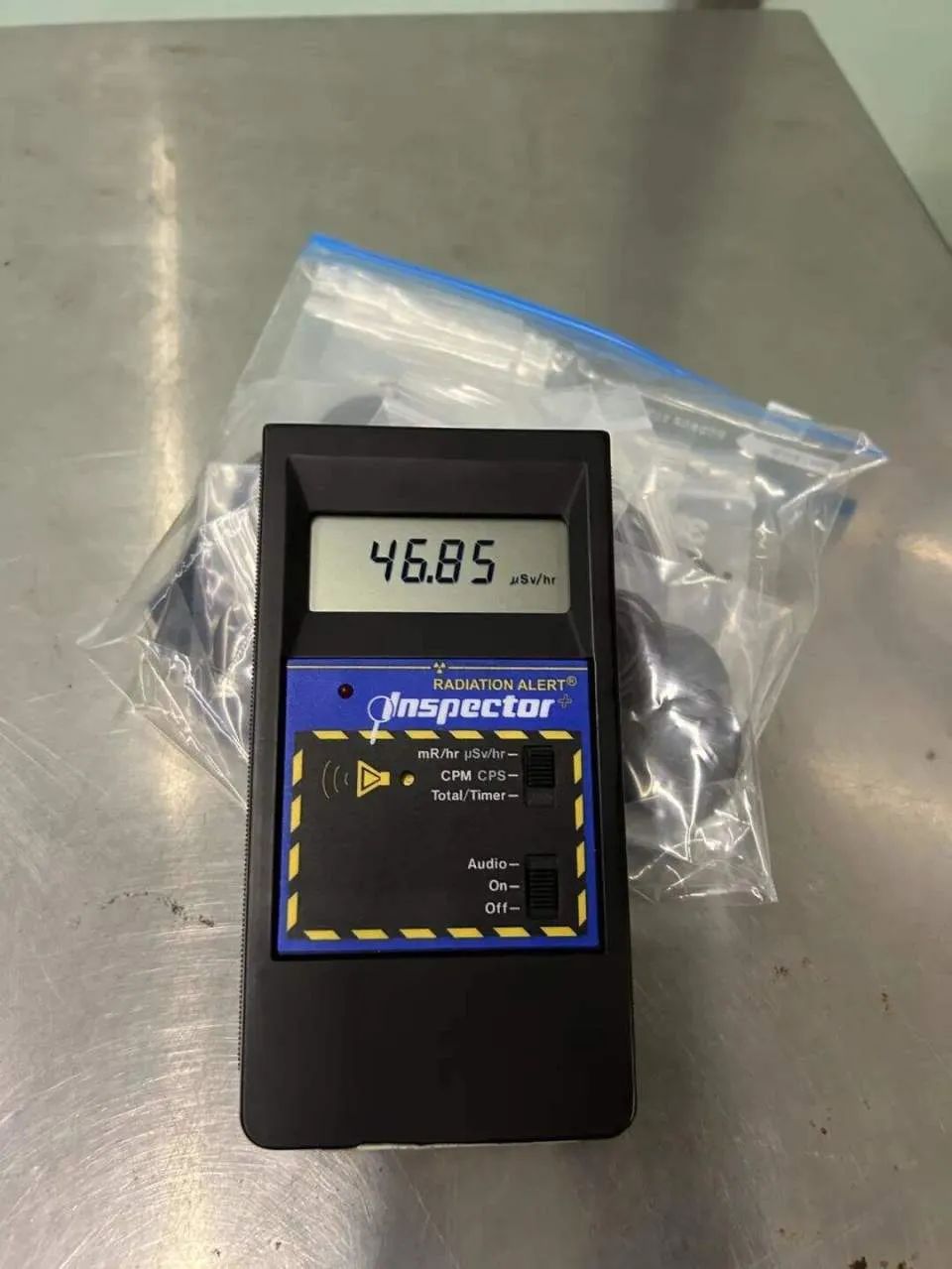 经现场关员复查,该旅客携带的一袋“保健石”核辐射超标,辐射量达105微西弗每小时,超出现场本底值1050倍(本底值是指没有进样时检测器的信号值)。