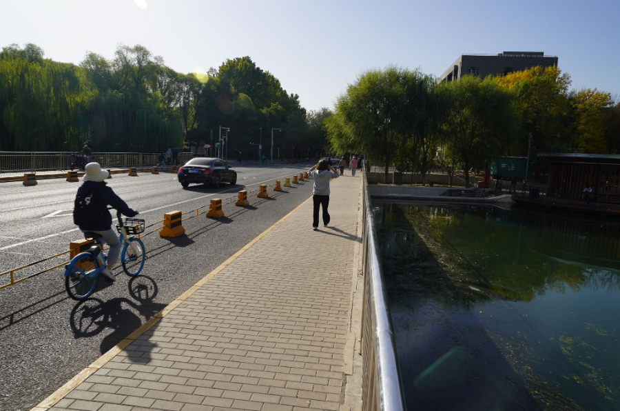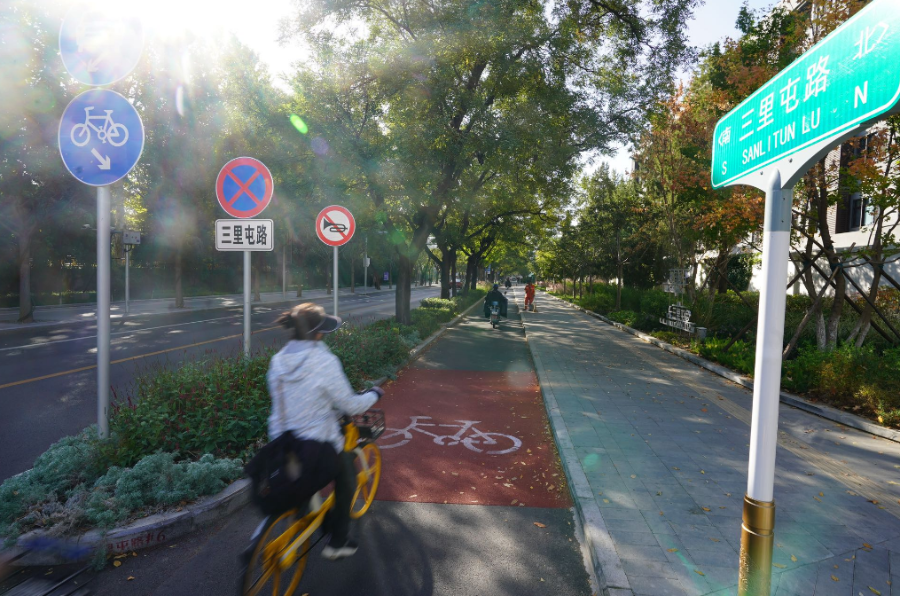 上午9时,记者来到三里屯路。小街自南向北单向行车,加设了一条非机动车道,两侧是宽阔的步行区域。高大的国槐和悬铃木伸展臂膀,为道路涂上了墨绿和橙黄,不时有跑友从林荫下穿过。