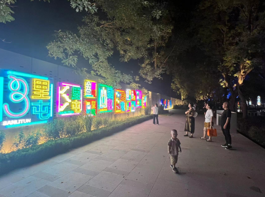 三里屯是本市知名的夜经济商圈,工程还应用了树灯、投影灯、影壁墙照明等多种景观设施,丰富街区夜间景观、提升街区活力。