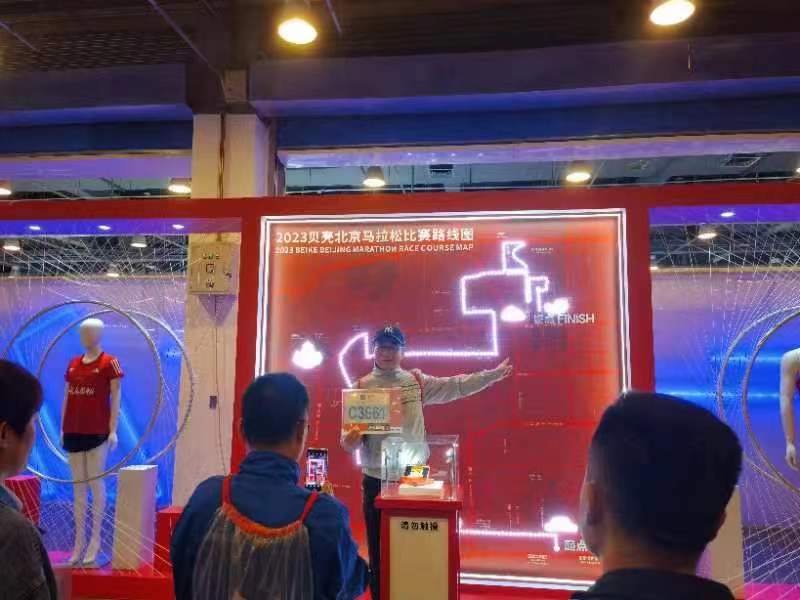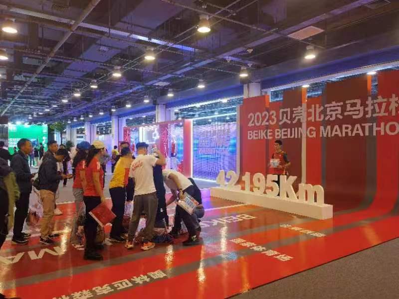 2023贝壳北京马拉松本周日即将鸣枪开跑。从26日开始,为期三天2023北京马拉松博览会在国家会议中心举行。北马的参赛选手们在领取参赛物品同时,还可参观、体验众多相关展位,提前感受马拉松运动的丰富内涵。前来的跑友们或在照片墙前拍照或参与互动游戏,一张张笑脸上展现出着对北马的期待。