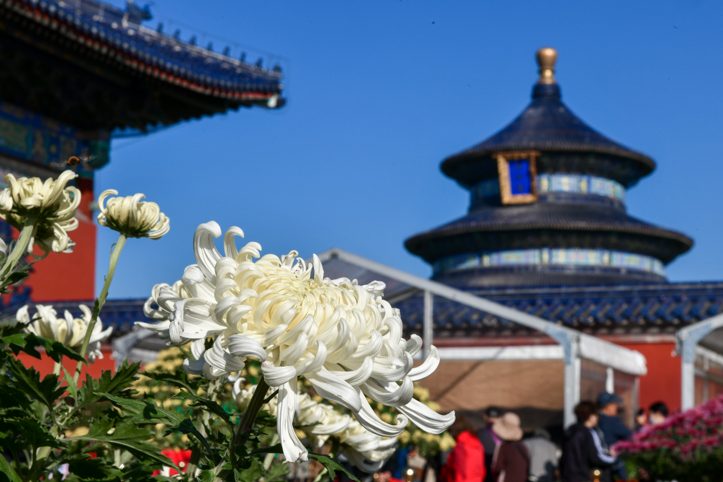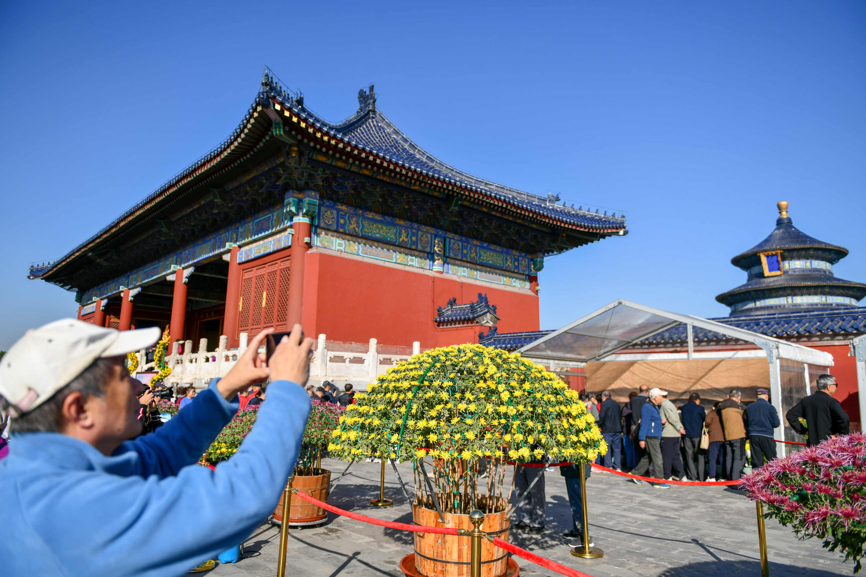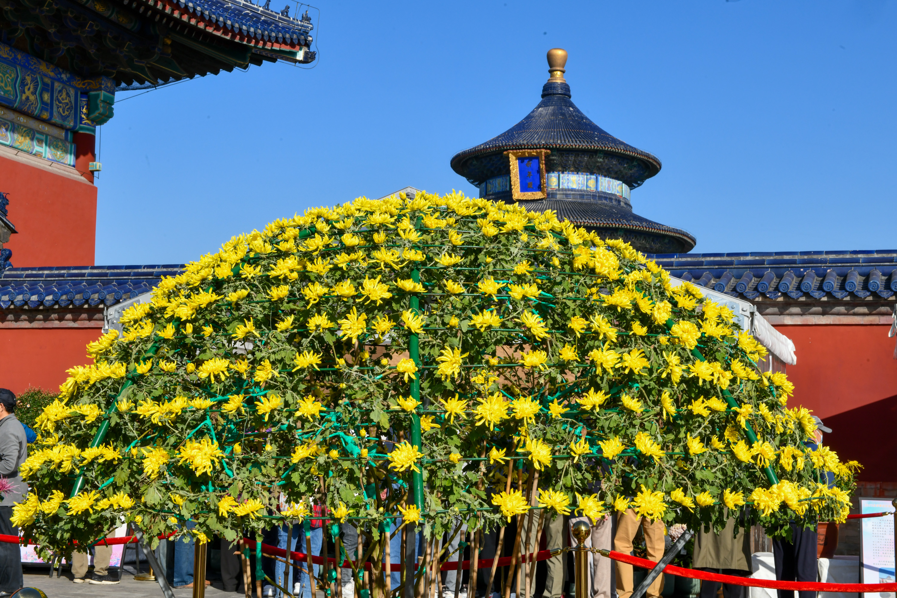 10月27日,天坛公园第42届菊花展在祈年殿景区内正式开展。此次菊花展以“福暖四季 风禾尽起”为主题,将一直持续至11月12日。今年的天坛菊花展以品种菊为主,同时展出大立菊、悬崖菊、造型菊、附桩盆景、多头菊等菊花共6000余盆,展区面积3000平方米。备受游客喜爱的伞状大立菊也出现在展览现场。